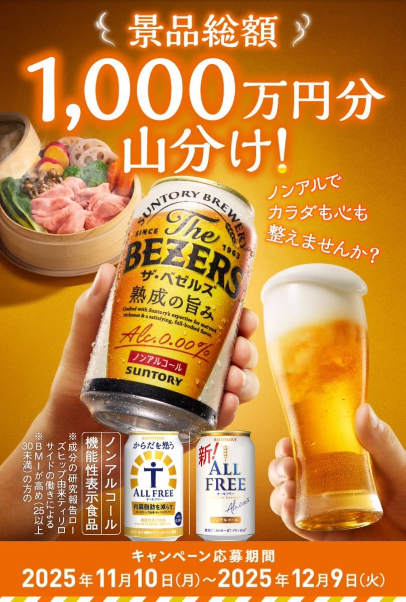 電気せいろ蒸し器などが当たる! 【12/9】サントリーノンアル オールフリー ベゼルズキャンペーン【レシ / LINE 】 - 大きいつづらと小さいつづら karappooo.hatenablog.com/entry/2025/11/… #クローズド懸賞 #プレゼントキャンペーン #懸賞情報 #懸賞