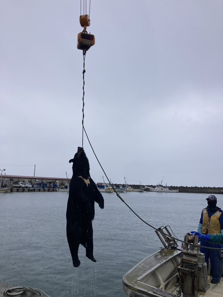 13日8時40分頃、青森県野辺地町の旧町立馬門小学校付近で目撃され、約1時間後の9時30分過ぎ、同町沖約200mの陸奥湾を泳いでいて、猟友会のハンターに駆除された、体長約1.5m、体重約140kgのツキノワグマの陸揚げの様子かな? x.com/toukon_t_s/sta…
