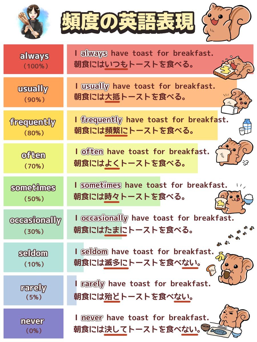 頻度を表す副詞は、このイメージで覚えれば一発です。 pic.x.com/sgQkhYT49d