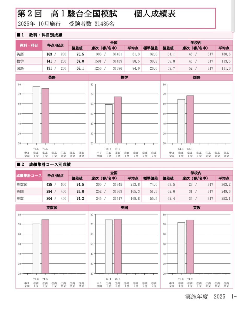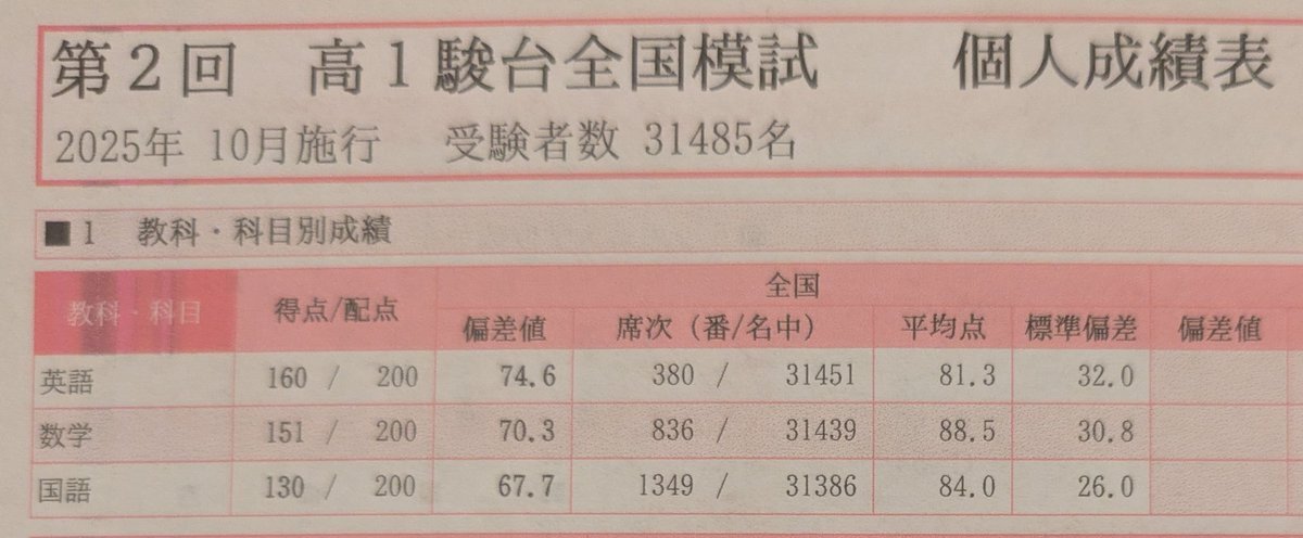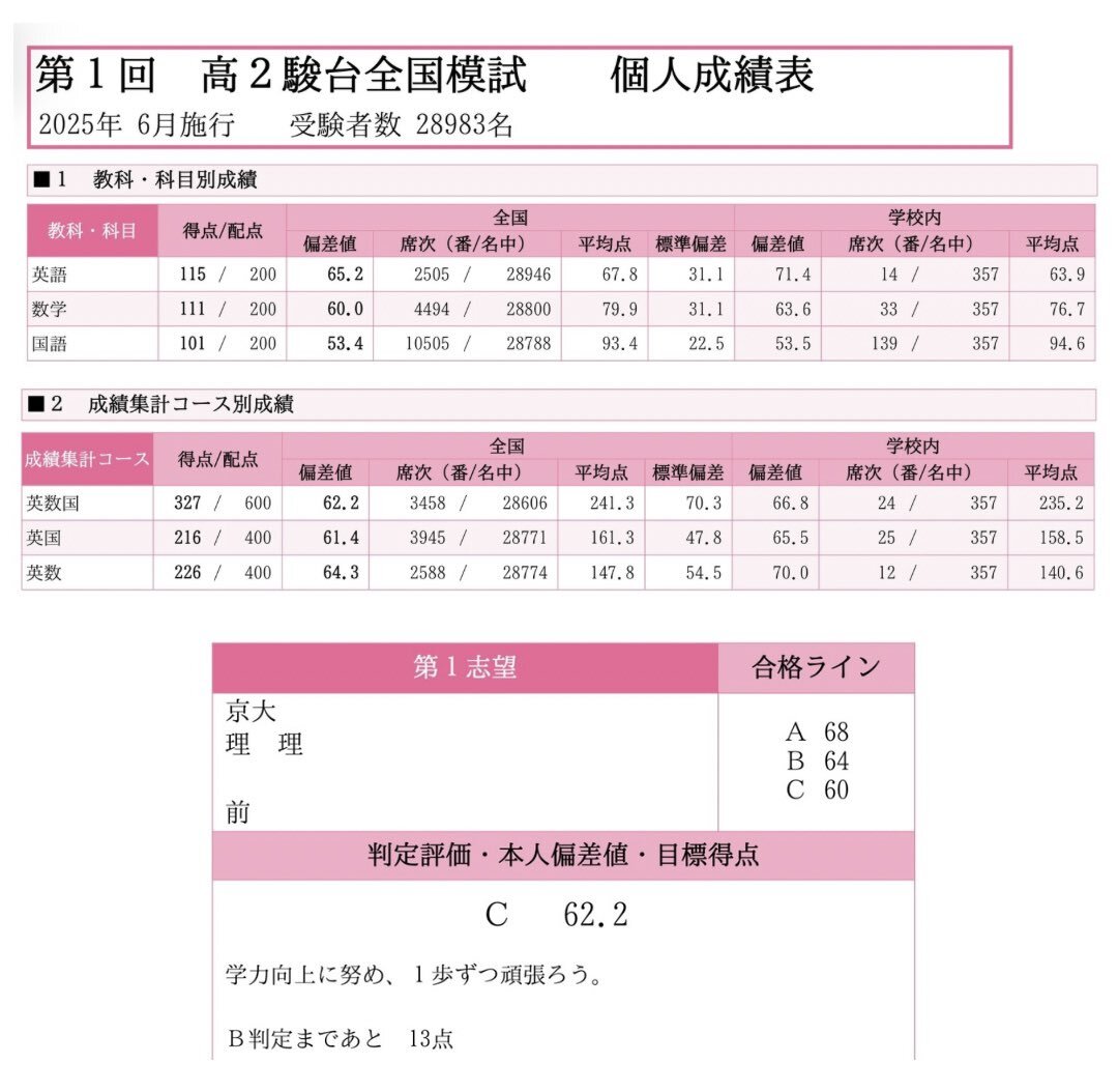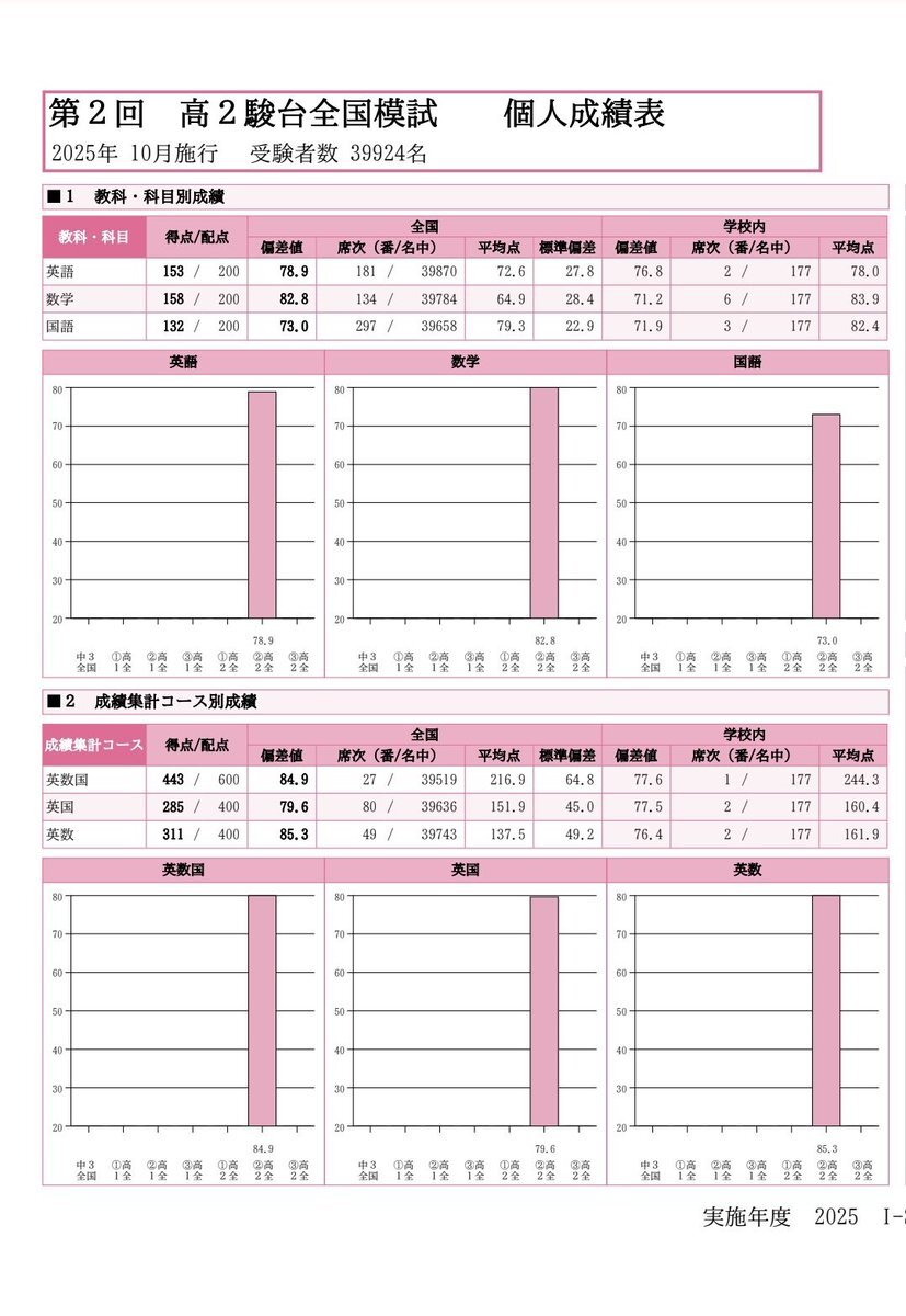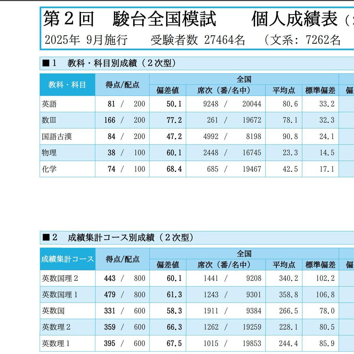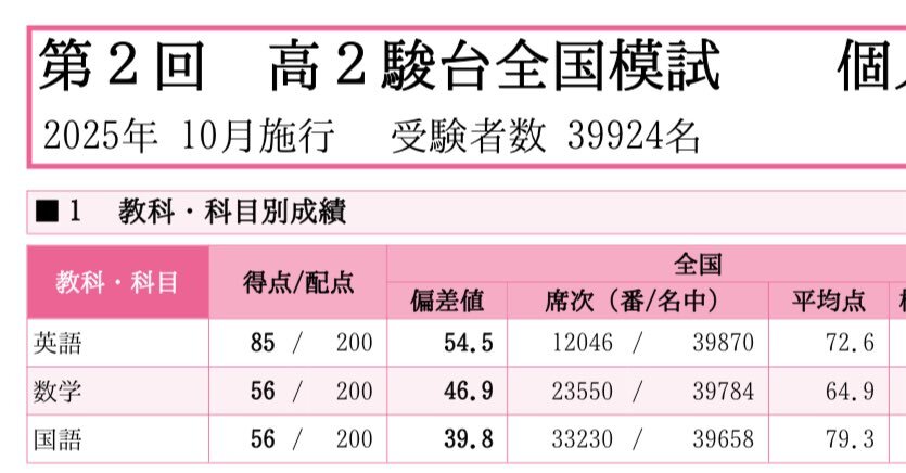 第2回高一駿台全国模試 一応画像でも 英語が日本語訳(?)での減点が多すぎてまずい 今回飛び抜けていい科目が全くないから総合もそんなに伸びなかった😢😢 色々反省しかないので頑張る💪💪 pic.x.com/jDY9GboGlc