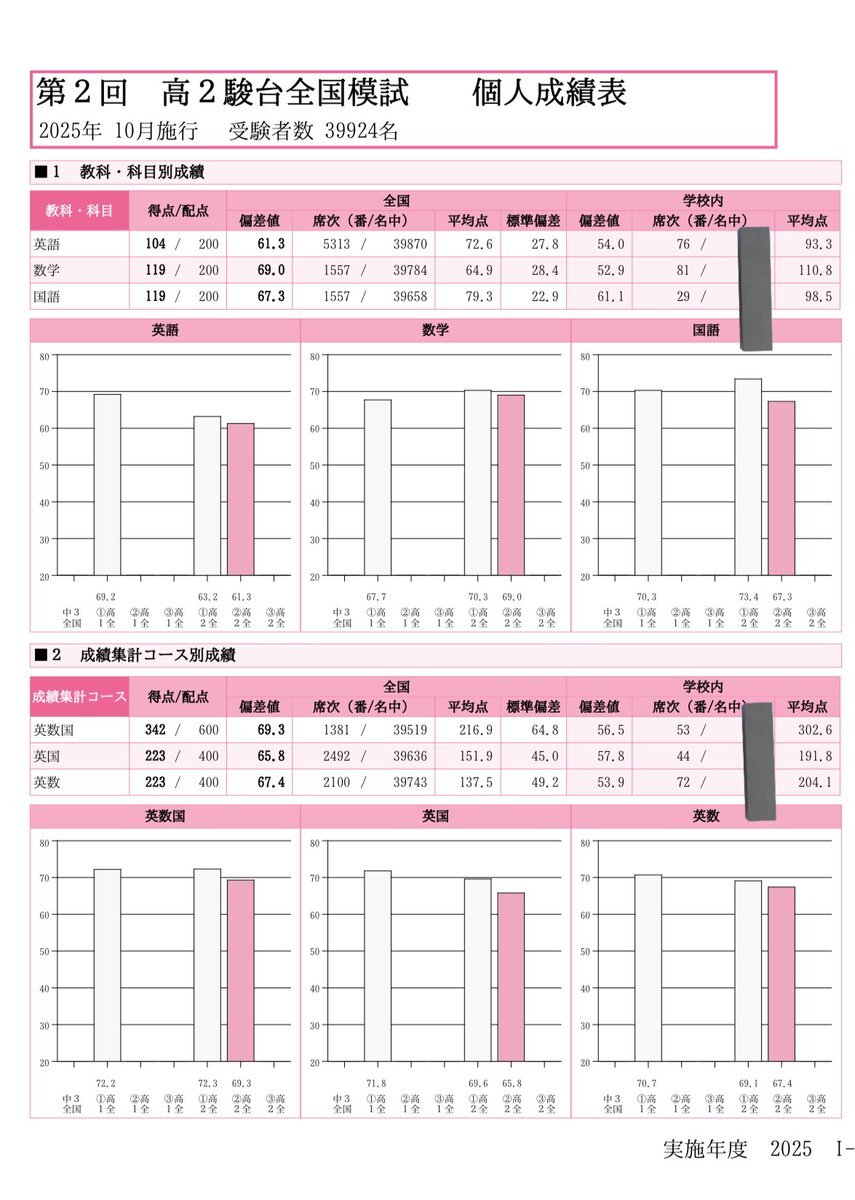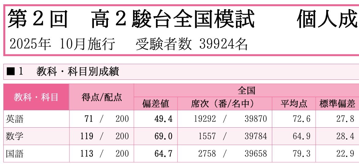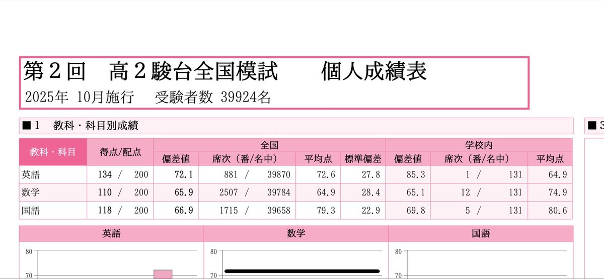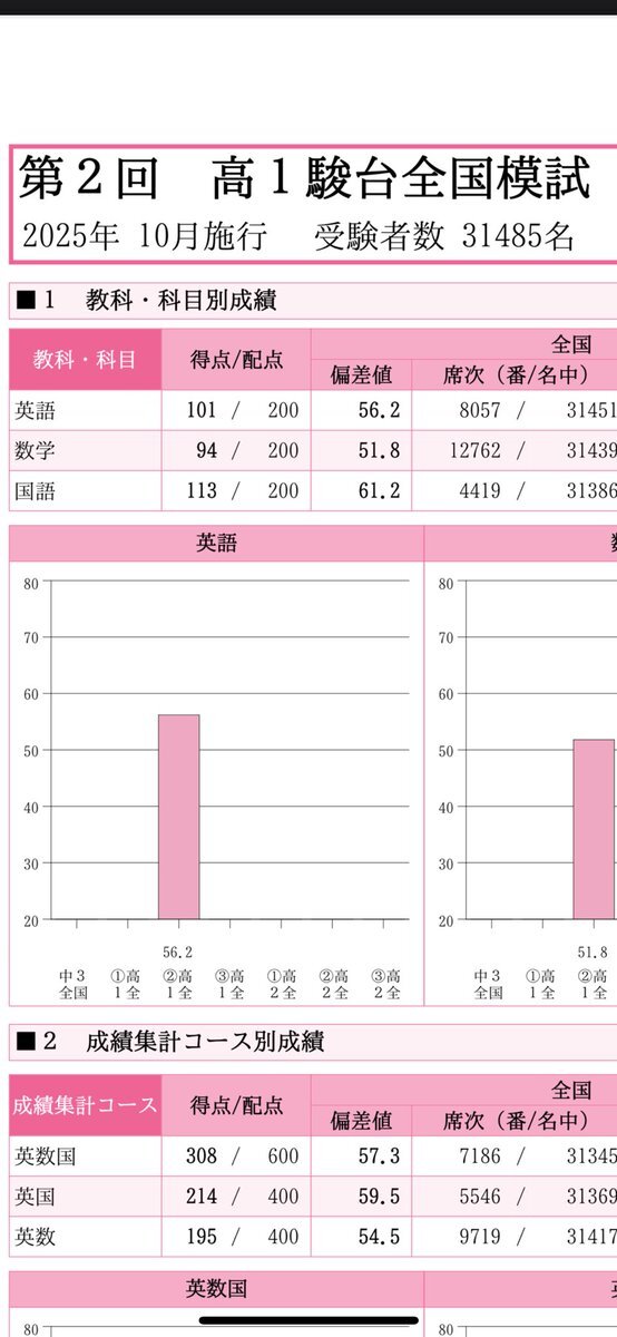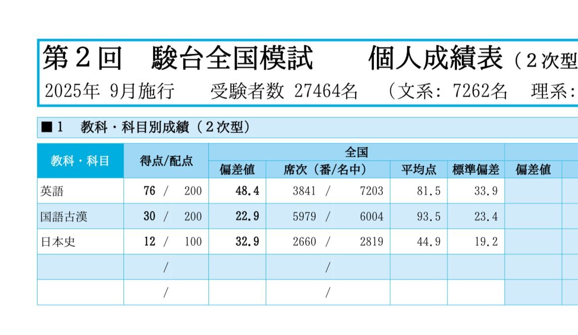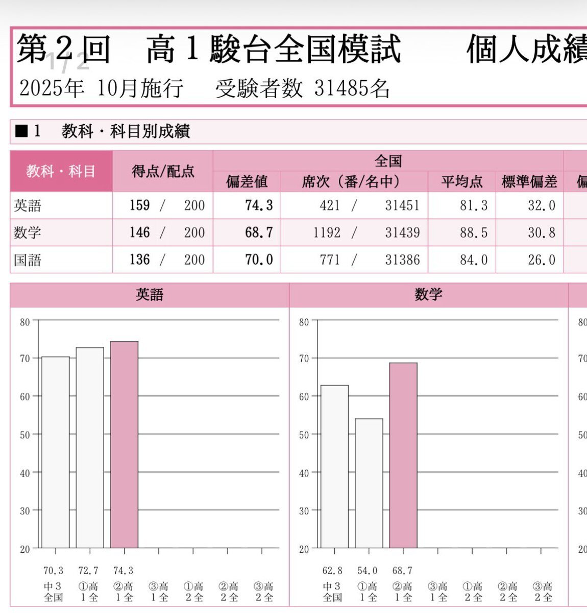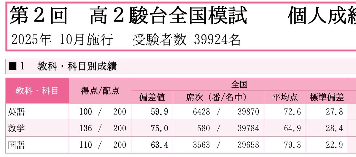 第2回高一駿台全国模試 一応画像でも 英語が日本語訳(?)での減点が多すぎてまずい 今回飛び抜けていい科目が全くないから総合もそんなに伸びなかった😢😢 色々反省しかないので頑張る💪💪 pic.x.com/jDY9GboGlc