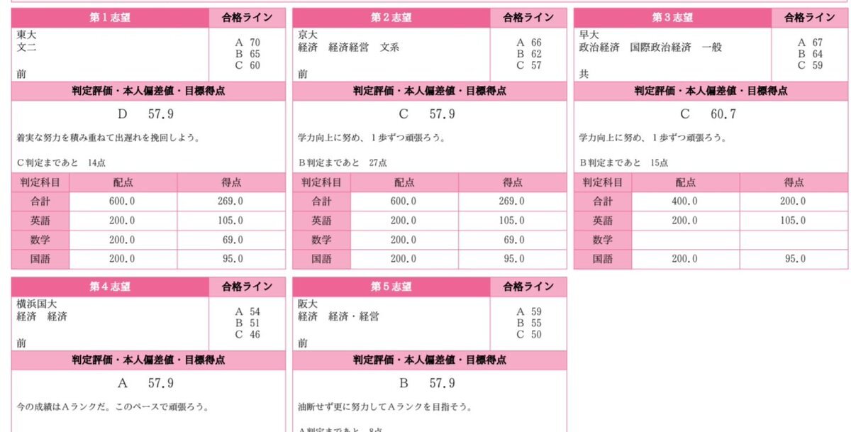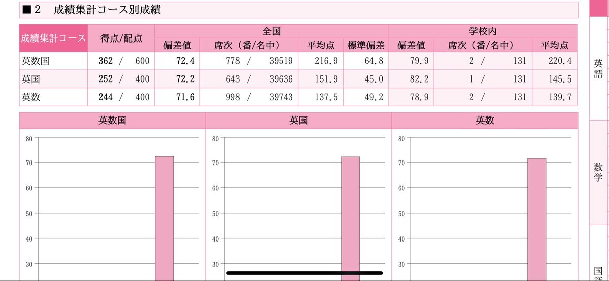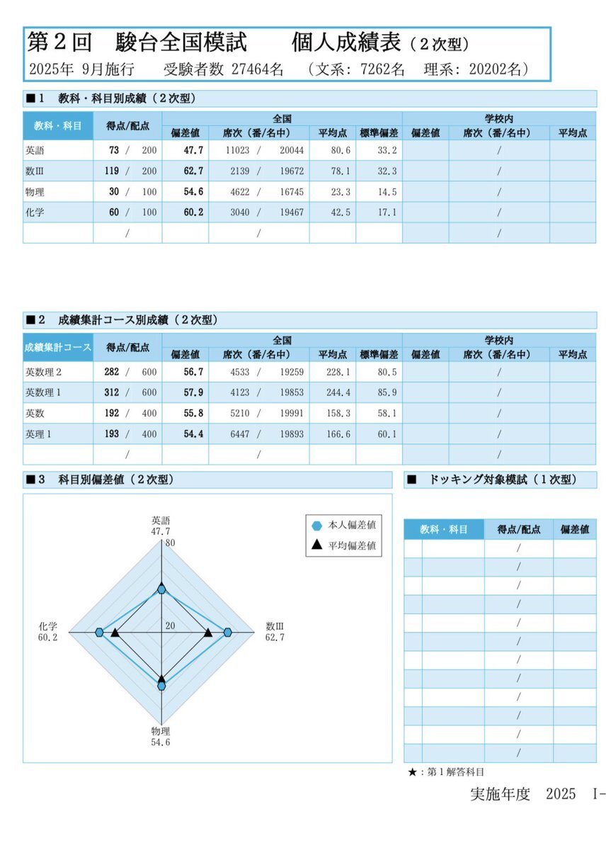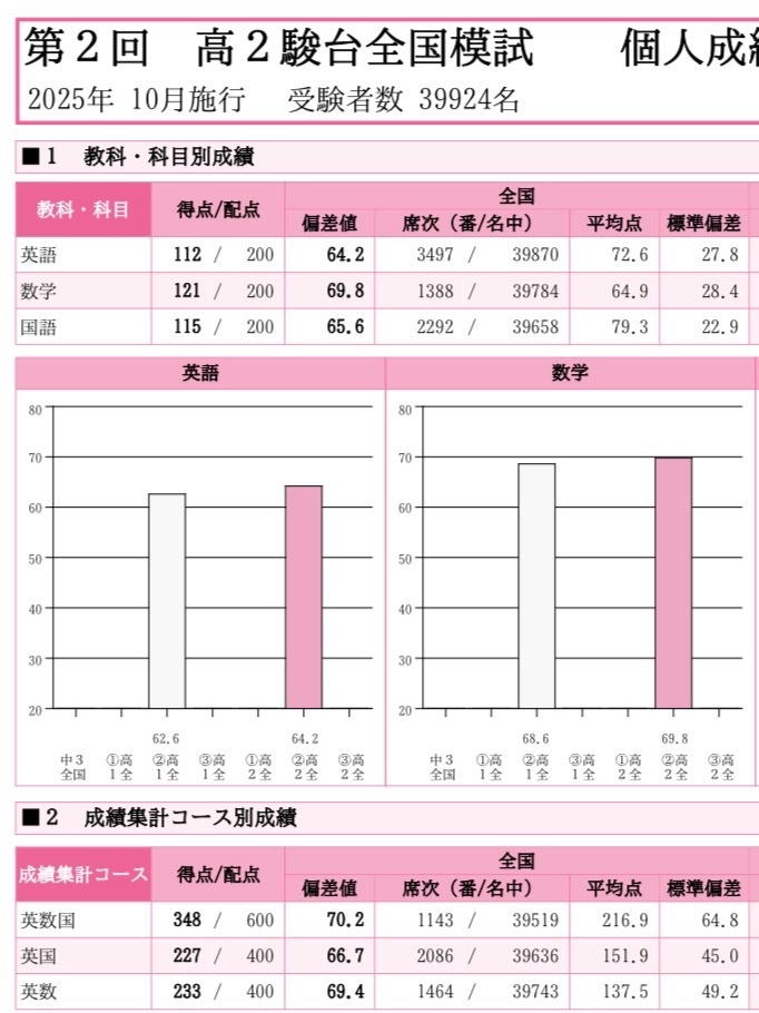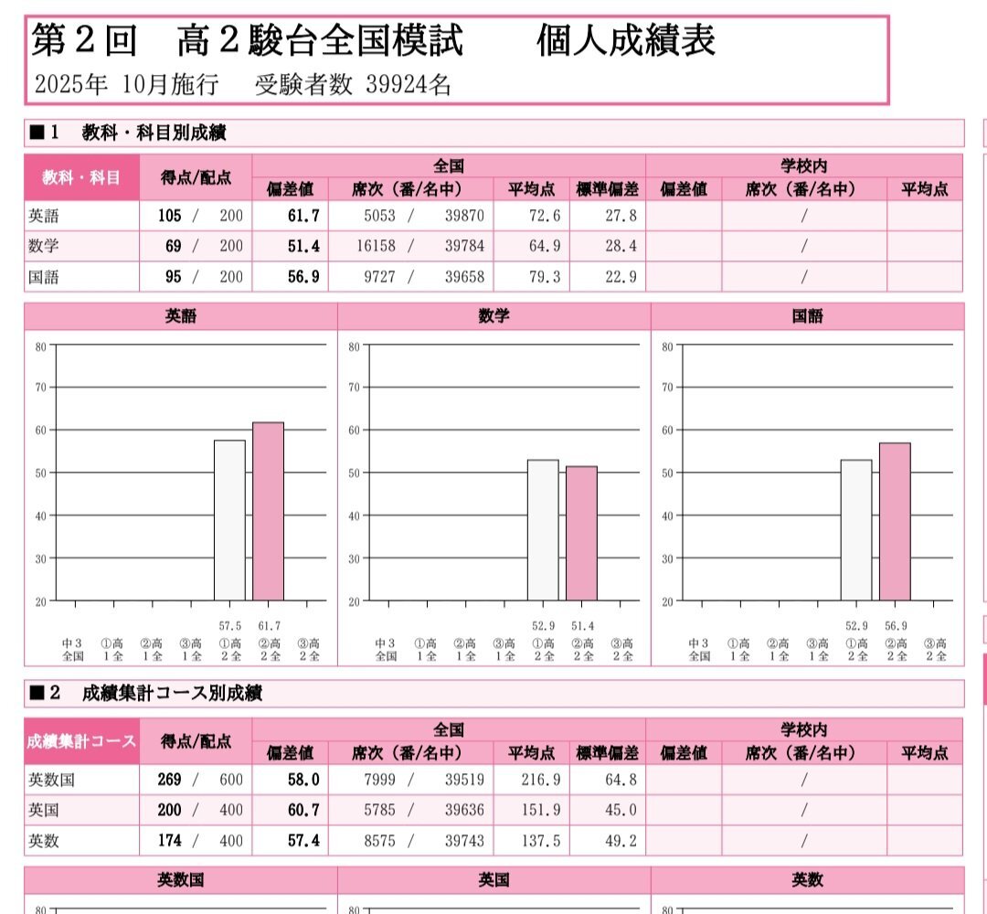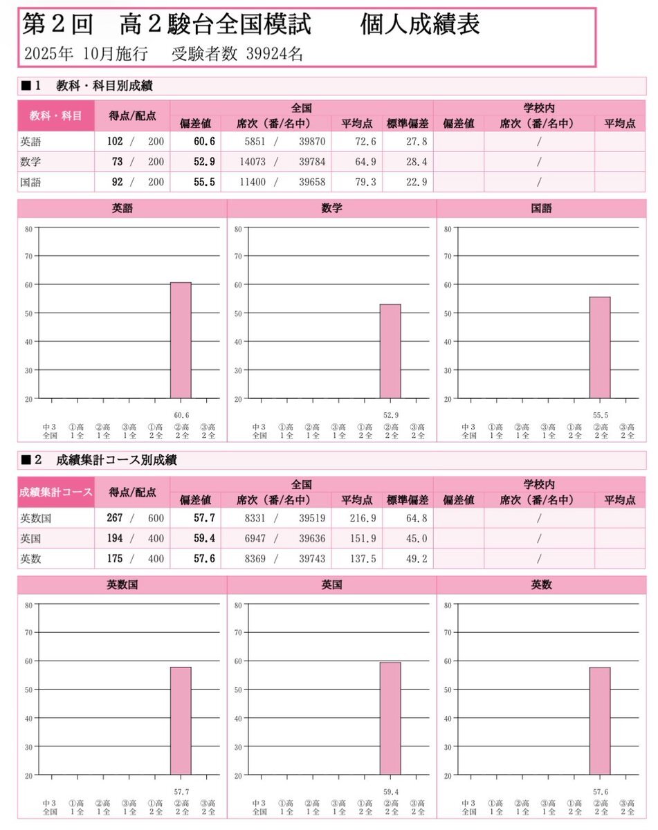 第2回高一駿台全国模試 一応画像でも 英語が日本語訳(?)での減点が多すぎてまずい 今回飛び抜けていい科目が全くないから総合もそんなに伸びなかった😢😢 色々反省しかないので頑張る💪💪 pic.x.com/jDY9GboGlc
