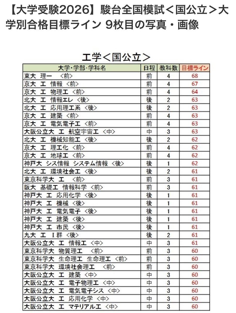 (理工は2020現役) 2022年第2回駿台全国模試前期合格者平均偏差値 英数理理 70 阪医 68 (理一) 医歯 66 (理二) 九 64 名 63 (京理) 千 神 62 東北 横 京府 阪公 61 (京工)(京農) 北 岡 広 59 名市 58 (東工) 筑 57 新 金 熊 鹿 56 信 和 長 55 浜 滋 鳥 山口 香 宮 54 (阪工) 琉 など9校 53 札 高 52 愛 x.com/taro858985/sta…
