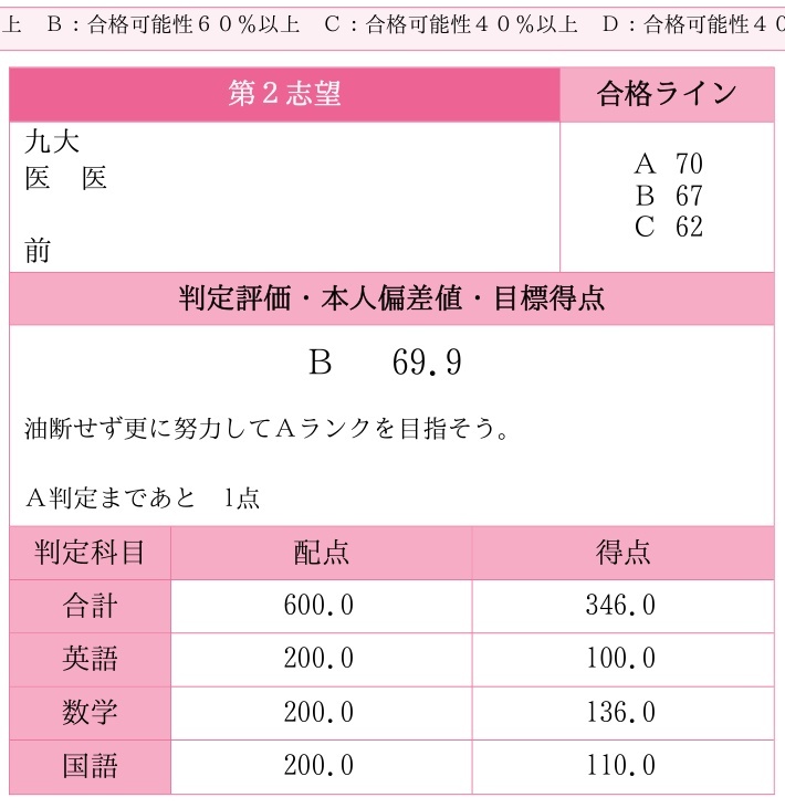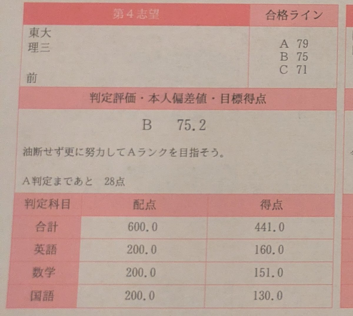 駿台第二回灯台実戦模試ついに明日か。 連続離散A判定頑張れ! 河合塾第二回燈台オープンと連続4回共燈台模試がA判定だった人は知人では全員離散合格している😌 さらに全部の駿台全国模試でも離散A判定だったらほぼ合格は間違いない。 受けた模試で全部離散A判定は一人しか知らないが余裕合格だった😌
