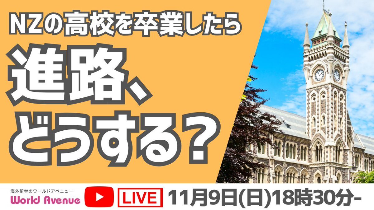 🌏✨【ニュージーランド高校留学 LIVE配信 第17弾】✨🌏 📅11月9日(日)18:30〜19:00(予定) 📍YouTube Live/@worldavenuetokyo 👉リマインダー登録はこちら! 🔗youtube.com/live/L98HBOsmJ…?... 🎓テーマ:ニュージーランド高校卒業後の進路について 高校卒業後の道はひとつだけではありません! pic.x.com/BYVuRPbFpf