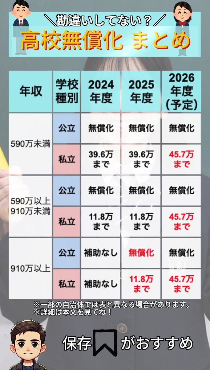制度改正により、高等学校等就学支援金制度や「高校授業料無償化」が見直され、公立高校を含め、世帯の年収(所得)に関わらず対象になるよう、年収制限が撤廃されました。具体的には、従来は世帯年収約910万円未満などの所得制限がありました。 来年も制度改正される予定なの知ってる? ↓↓↓ pic.x.com/iuV3TlCyqa