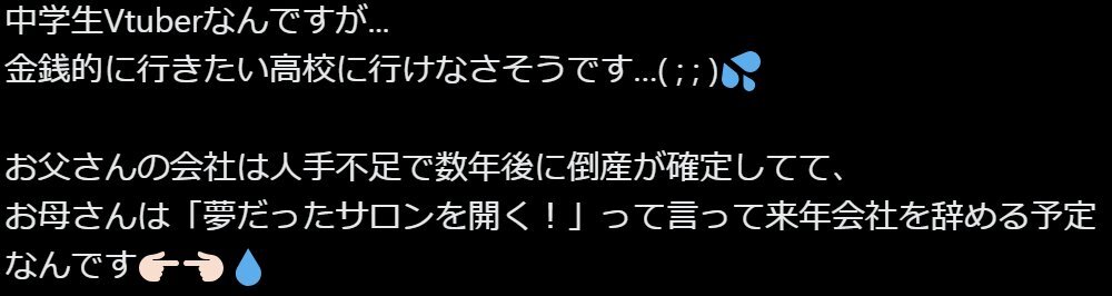 中学生Vtuberなんですが... 金銭的に行きたい高校に行けなさそうです…( ; ; )💦 お父さんの会社は人手不足で数年後に倒産が確定してて、 お母さんは「夢だったサロンを開く!」って言って来年会社を辞める予定なんです👉🏻👈🏻💧 正直めっちゃ不安です…。 ...でも!高校生になったら