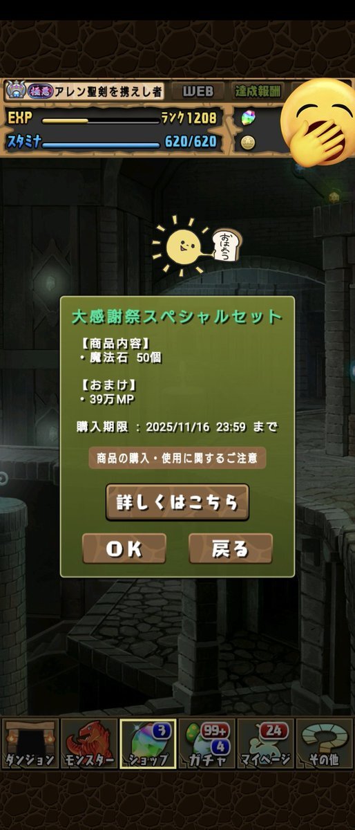 今日の #パズドラ❗️ 今回は 現在、開催されている #大感謝祭 などをピックアップ。 今年も大感謝祭の季節がやってきました✨ 25日ログインする事で魔法石100個に13周年たまドラと今年も盛大に始まりました。 ※魔法石ショップにもいつもは8000円のセットが5000円になって売っています。 pic.x.com/jR3MQUiCJ0