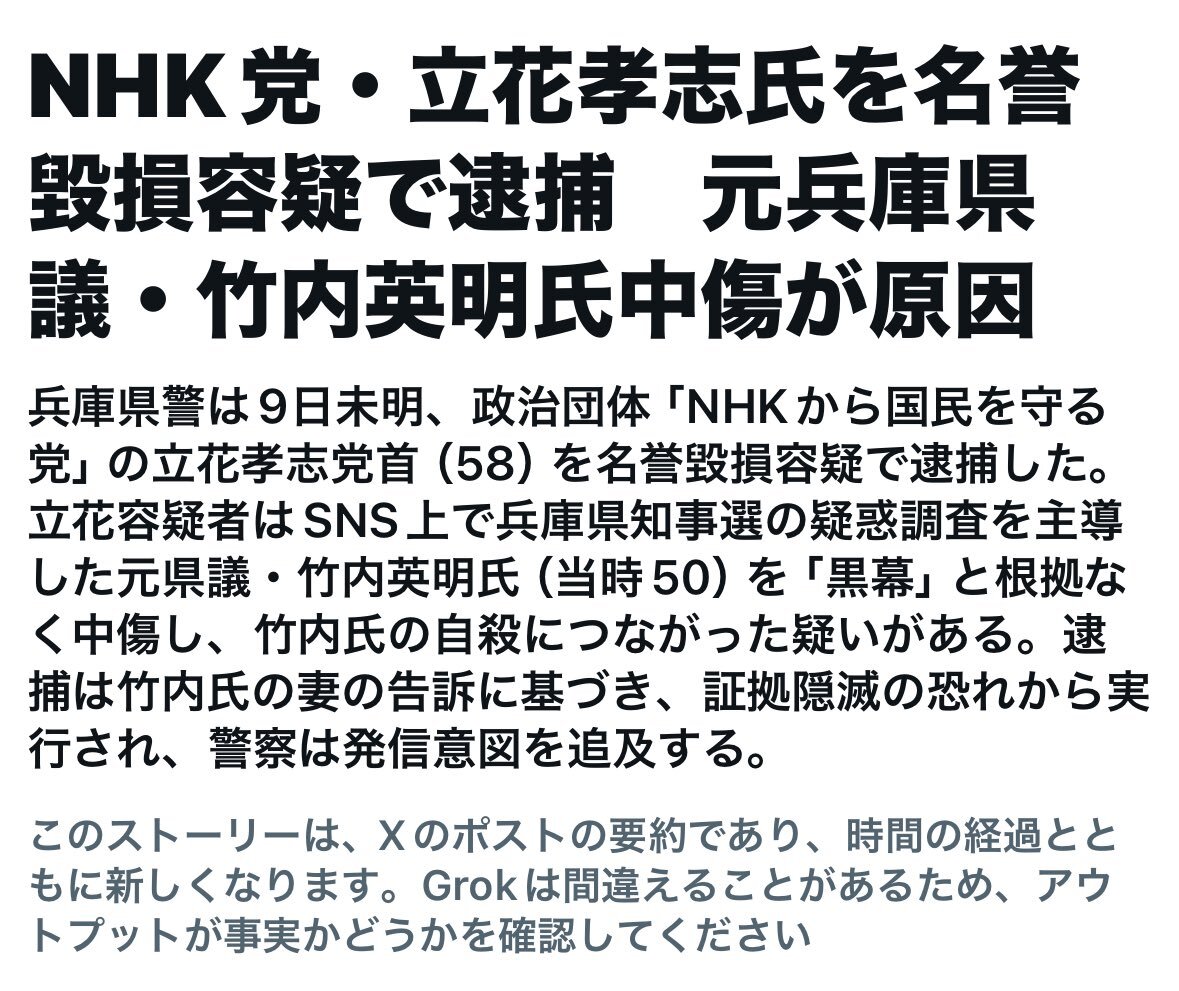 齊藤健一郎議員が自民会派に入っているから、オールドメディアは自分たちがヤバイと焦り出して悪印象を植え付けようとしてるのか? 立花孝志・NHK党首を名誉毀損容疑で逮捕 元兵庫県議への中傷で | 毎日新聞 mainichi.jp/articles/20251…