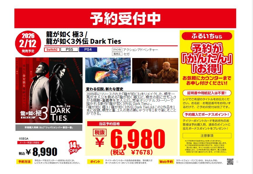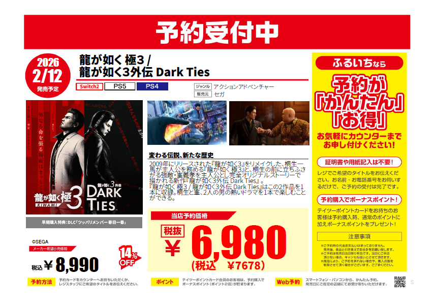 ⭐️予約受付中‼︎⭐️ #PS4 #PS5  #Switch2 ✅ 『龍が如く 極3 / 龍が如く3外伝 Dark Ties』 「桐生一馬」「峯義孝」主人公の2作品がこの一本で‼️ 沖縄、東京の街並みや バトルアクションやドラマシーンが更に進化! ご予約はお気軽に店頭スタッフまで‼︎✨ pic.x.com/mL7F7UK3TQ