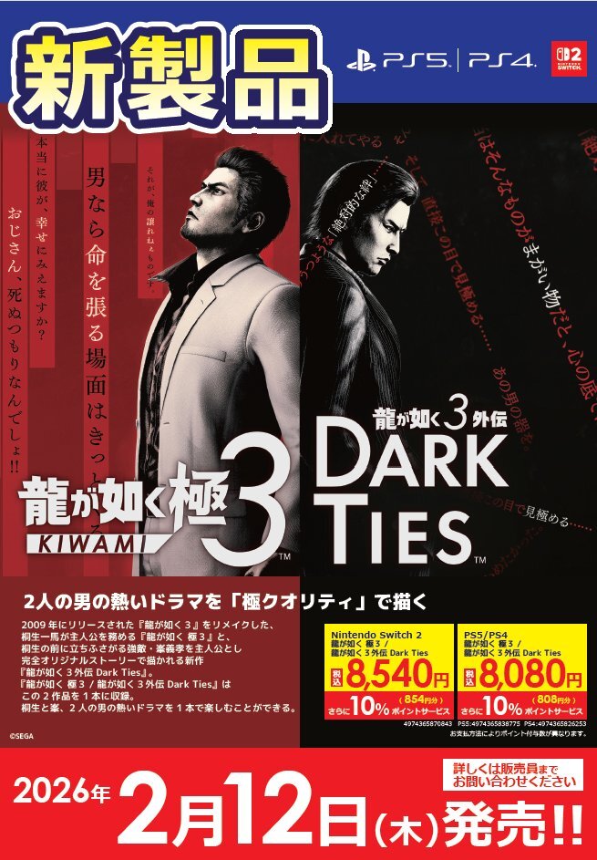 2026/2/12発売予定 #龍が如く 極3 / 龍が如く3外伝 Dark Ties 予約受付中です! 桐生一馬が主人公の『龍が如く3極』と、峯義孝を主人公とし完全オリジナルストーリーで描かれる新作『龍が如く3外伝 Dark Ties』が1本に収録! ※Switch2/PS5/PS4のバージョン違いにご注意ください。 pic.x.com/Z3dpZGBK3R x.com/ryugagotoku/st…