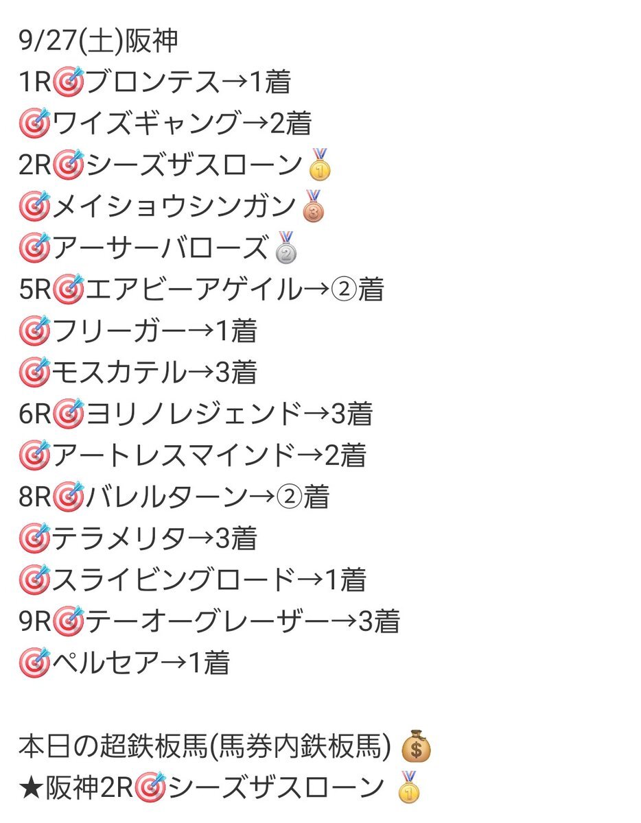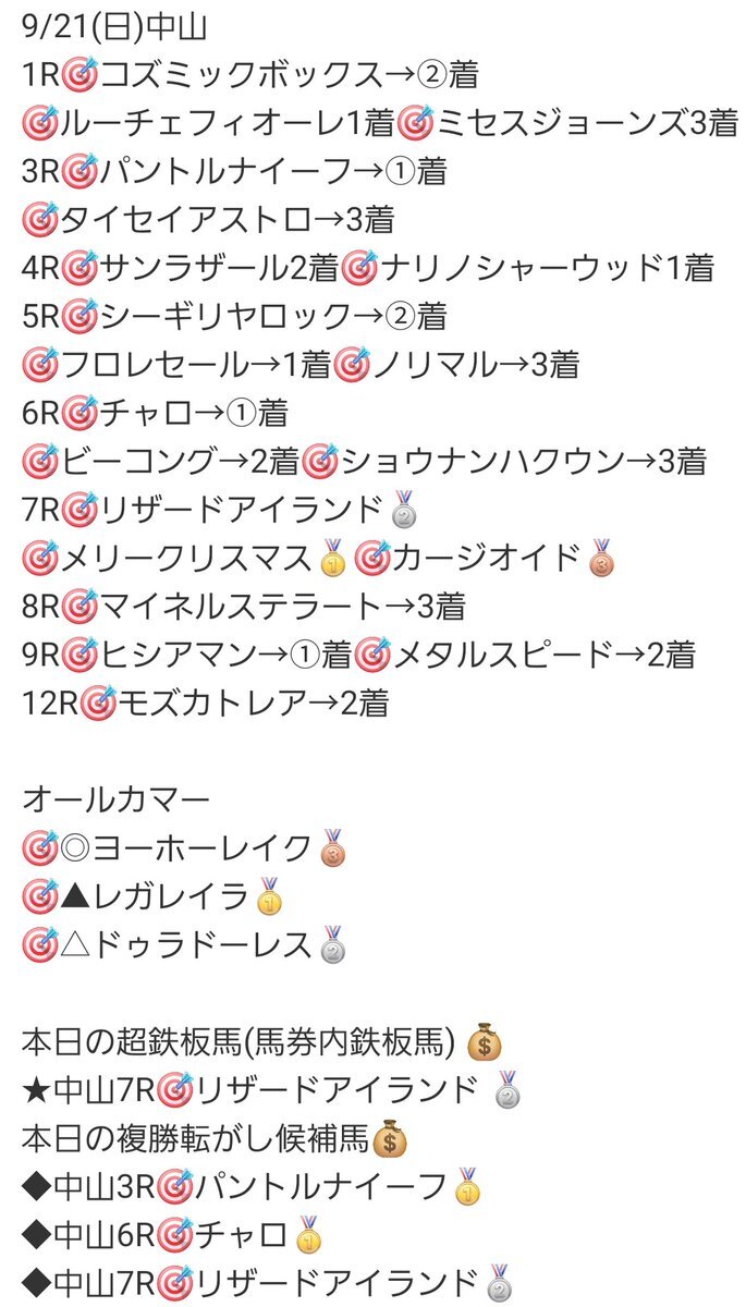 中央競馬よろしくです🙇 先週はセントライト記念🎯、 オールカマー🎯、神戸新聞杯🎯 只今、中央重賞本命馬7連続🎯 9月中央超鉄板馬🐎 7の7🎯(3,3,1,0) パーフェクト💯 先週の勝負馬🏇 12の10🎯(5,4,1,2) 中山パーフェクト💯 推奨馬&勝負馬は noteにチップ下さった方にnote登録メアドに送ります🙇