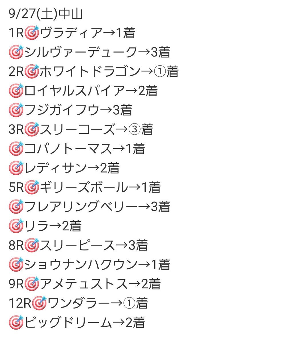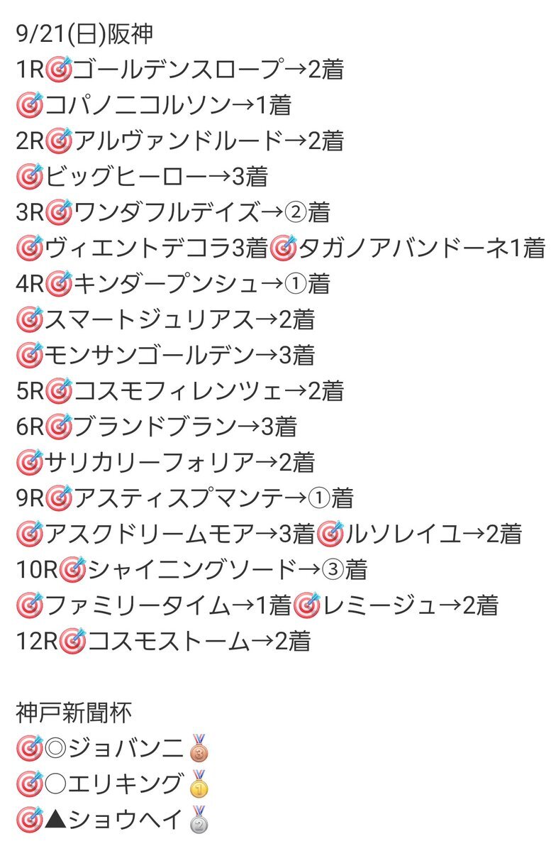 中央競馬 ありがとうございました🙇 中央重賞7連続🎯 オールカマー🎯、神戸新聞杯🎯 前回のG1宝塚記念🎯 ◎メイショウタバル🥇(7人) 9月中央超鉄板馬💰 7の7🎯(3,3,1,0) パーフェクト💯 本日の複転がし候補馬 3の3🎯(2,1,0,0) パーフェクト💯 本日の勝負馬 12の10🎯(5,4,1,2) 中山パーフェクト💯 pic.x.com/jSnXj13m5k x.com/tlBCt10XdAyj5u…
