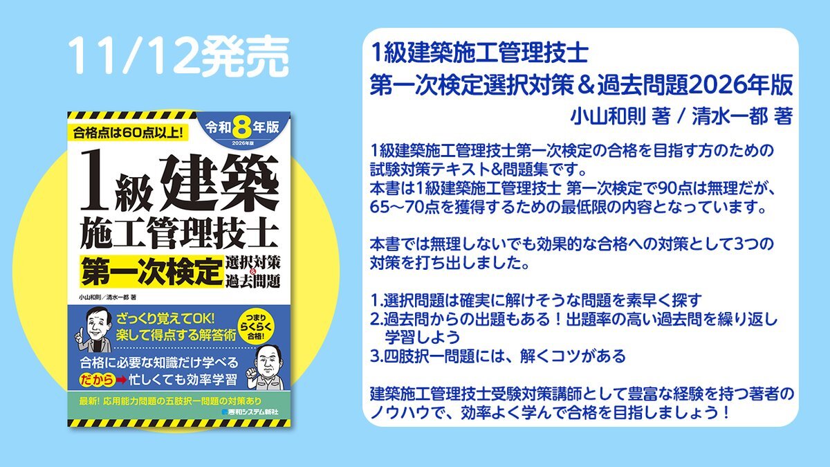 =本日発売!= 11/12に下記の新刊登場! 小山和則 著 / 清水一都 著 『1級建築施工管理技士第一次検定選択対策&過去問題2026年版』 amzn.to/3LA6LJt なるべく楽して合格したい!そんな思いに応えて編集いたしました。 pic.x.com/Nq5SlMu9Tt