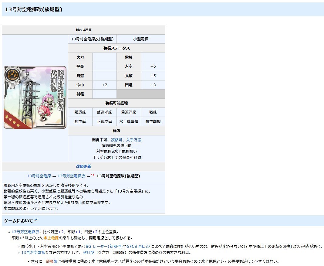 ぜかましさん、21号対空電探改二よりも、13号対空電探改後期型)好きですよね。 一部の艦の補強増設に入る上、水上電探でもある。 阿賀野型の補強増設に入るので、夜間瑞雲の発動率も上がる。 13号対空電探というか、小型電探のひとつのエンドコンテンツですね。 pic.x.com/fL18GxUYQd