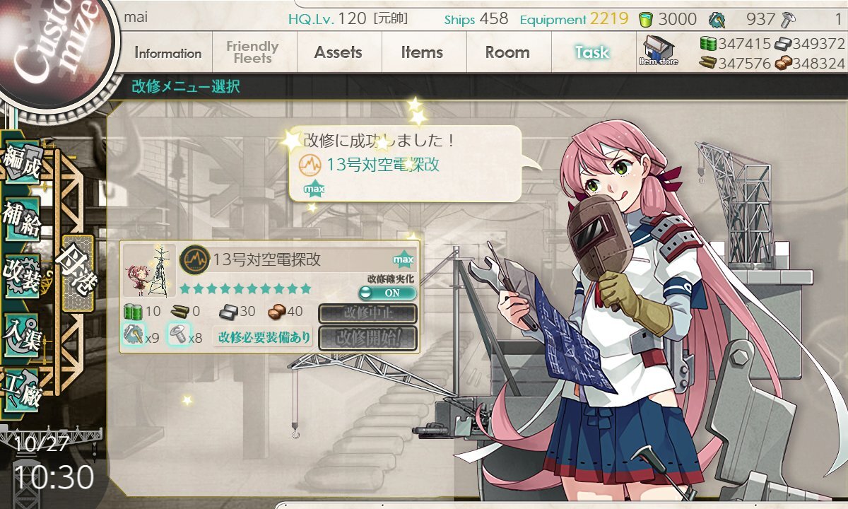 続)改二で初期装備が試製烈風後期型13号対空電探改・21号対空電探・12cm30連装噴進砲と改装時に使う装備が揃ってる。試製烈風後期型が余り気味だったが烈風一一型の改装で使うため本当に捨てる装備なしになった。
