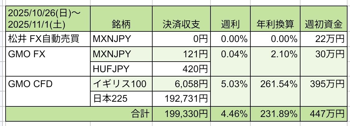 ミドルリスク資産運用の成績 10/26~11/1 +19.9万円 #松井FX +0円 #GMOFX +541円 #GMOCFD +198,789円 日本225の爆上げにより今週も大量決済を頂きました イギリス100も含め調整に警戒しておきます #トラクラ x.com/wato_chi/statu…