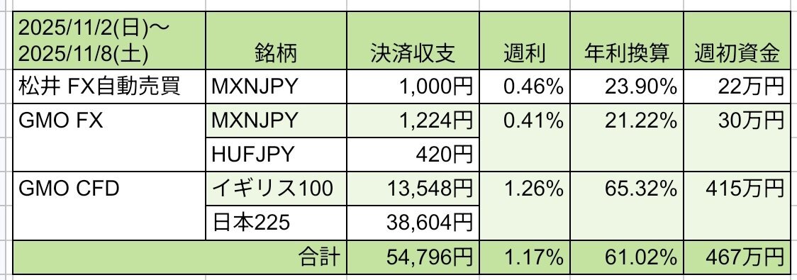 ミドルリスク資産運用の成績 11/2~11/8 +5.4万円 #松井FX +1,000円 #GMOFX +1,644円 #GMOCFD +52,152円 日本225、イギリス100、ともに仕掛け範囲を越えて大きく下げました こんな時は静かに見守るのが一番です #トラクラ pic.x.com/coQ9zzrwwM x.com/wato_chi/statu…