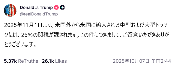 中・大型トラックに25%関税、11月1日から トランプ氏 (日本時間 10/7 4:40 ロイター) >トランプ米大統領は6日、米国に輸入される中・大型トラックに対し、11月1日から25%の関税を課すと発表した。 jp.reuters.com/world/us/MNLVJ…
