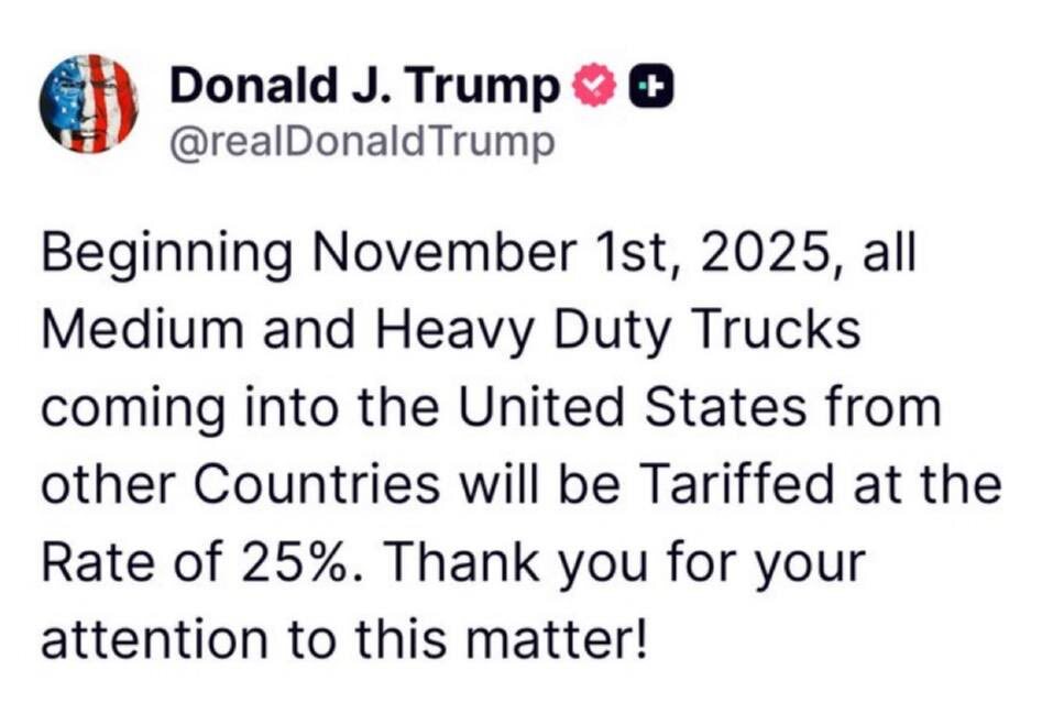 TRUMP STATEMENT: Beginning November 1st, 2025, all Medium and Heavy Duty Trucks coming into the United States from other Countries will be Tariffed at the Rate of 25%. Thank you for your attention to this matter!