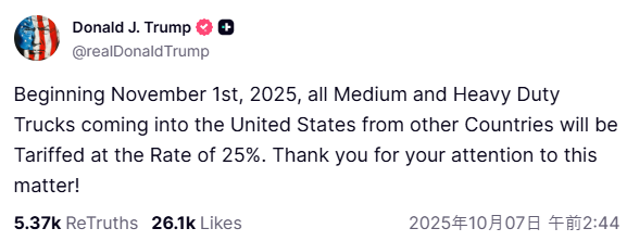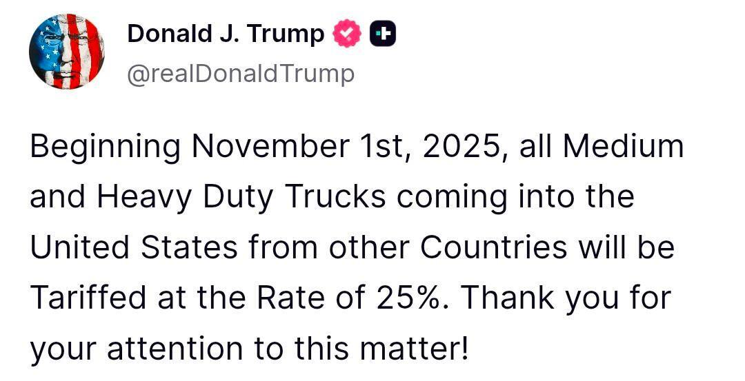 JUST IN - President Trump: "Beginning November 1st, 2025, all Medium and Heavy Duty Trucks coming into the United States from other Countries will be Tariffed at the Rate of 25%. Thank you for your attention to this matter!"