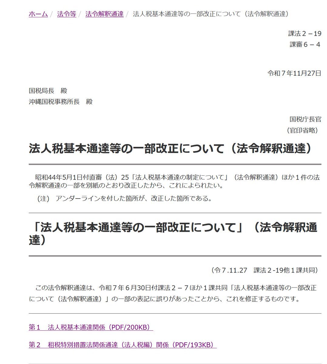 「法人税基本通達等の一部改正について(法令解釈通達)」 この法令解釈通達は、令和7年6月30日付課法2-7ほか1課共同「法人税基本通達等の一部改正について(法令解釈通達)」の一部の表記に誤りがあったことから、これを修正するもの nta.go.jp/law/tsutatsu/k… pic.x.com/c2tRbphjpL