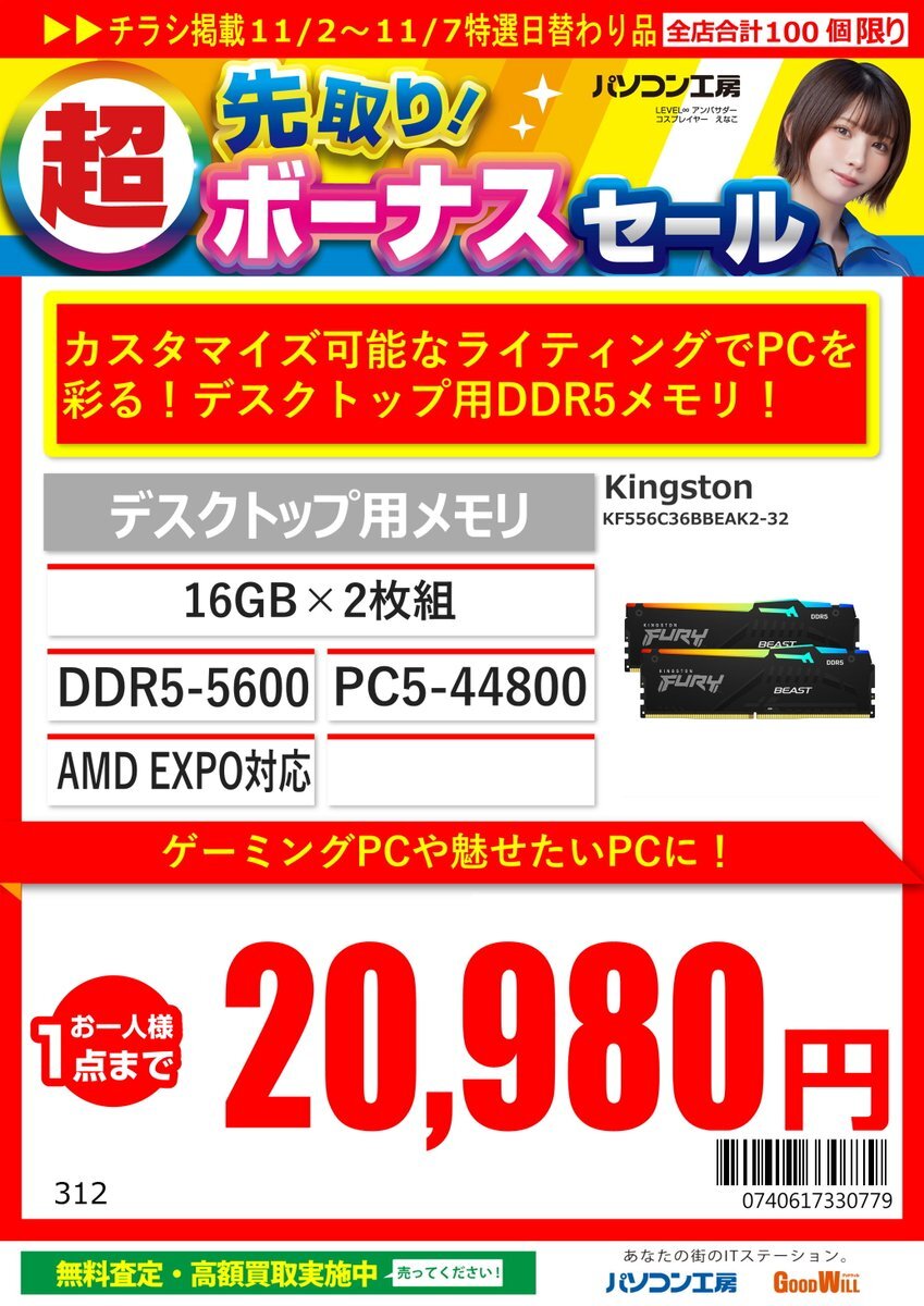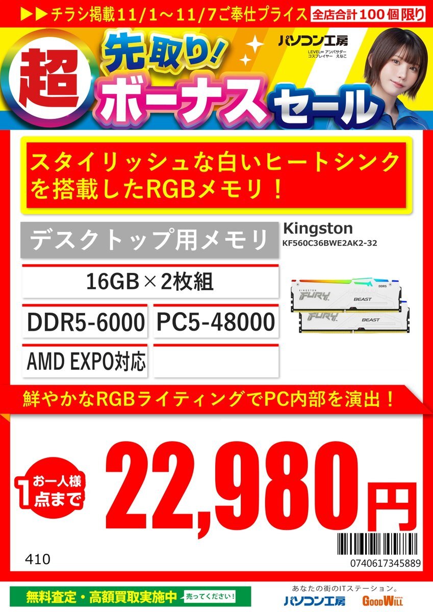 超先取り‼️ボーナスセール 2日からのセールに KINGSTONよりKF556C36BBEAK2-32 があります‼️ 16GB×2枚32GB PC5-44800(DDR5-5600)規格 🌈光らせられる🌈メモリがセールに登場❗️ #KINGSTON #パソコン工房 #静岡店 #自作PC #白PC pic.x.com/8sp1L6YjMy