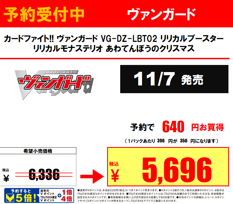 ⚡️予約情報⚡️ 11/7(金)発売 #ヴァンガード 『リリカルブースター リリカルモナステリオ あわてんぼうのクリスマス』 予約受付開始❗️ ご予約だと、1BOX定価6,336円(税込)が▶️5,696円(税込)となり 640円お買得です🎵🉐 pic.x.com/QbKOCd9XUQ