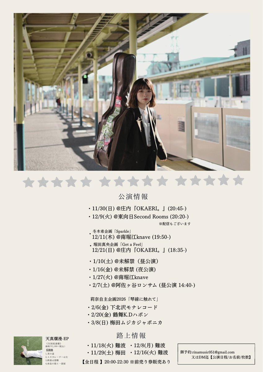 ˚✧₊⁎公演予定˚✧₊⁎ \ 12月は3本🎄 / 12/9(火) 東向日Second Rooms 12/11(木) 南堀江knave 12/21(日) 庄内『OKAERI。』 御予約はDM迄【日程/お名前/枚数】 ____________________________ 莉奈自主企画2026 嗚呼神様よ東名阪リリースツアー 「琴線に触れて」 御予約 forms.gle/NQJ5ja7nTjdTew…
