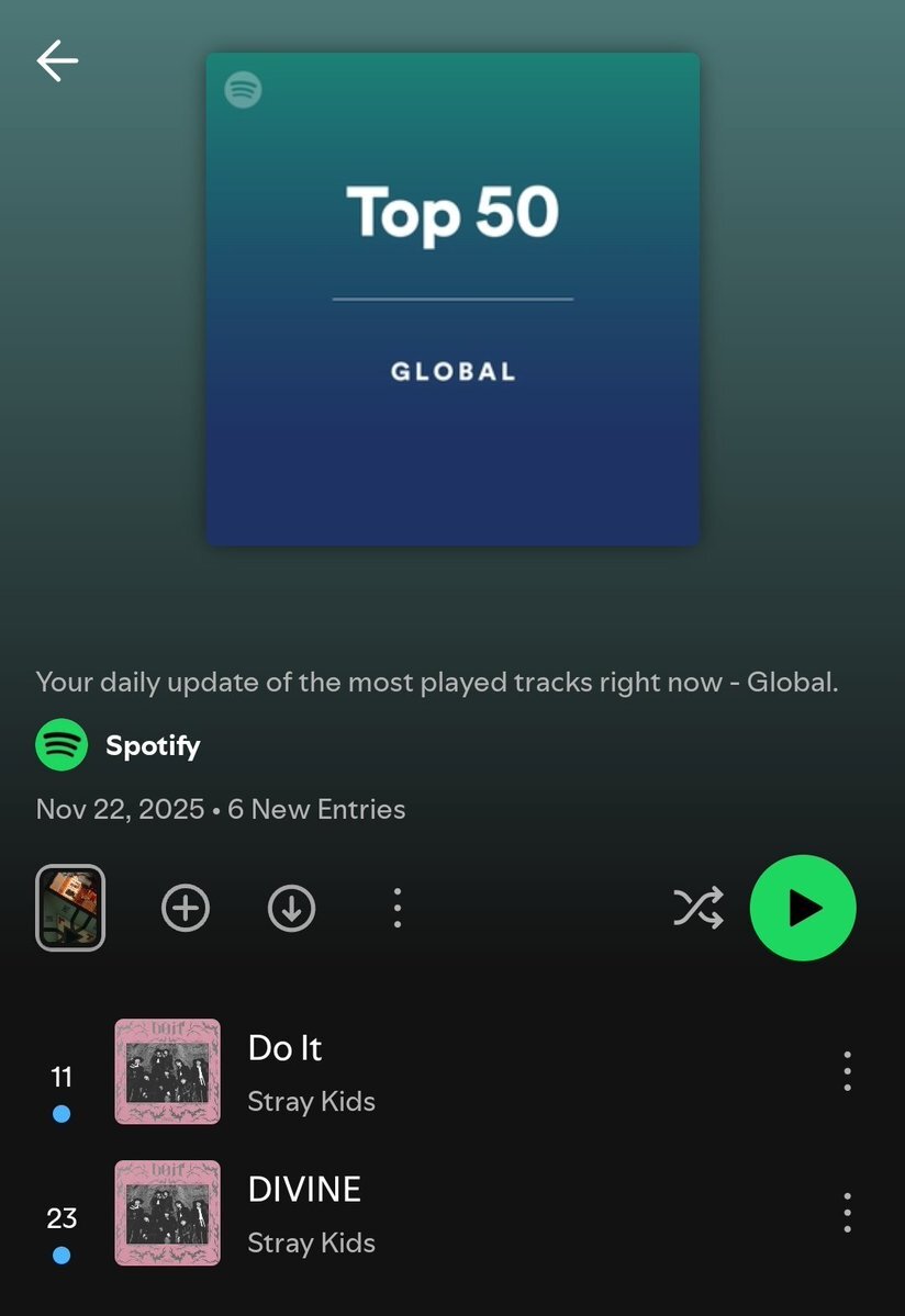 日本における11月21日付Spotifyデイリーチャート、200位以内の初登場曲。 62位 #StrayKids「Do It」 90位 Stray Kids「DIVINE」 131位 Stray Kids「Holiday」 143位 Stray Kids「Photobook」 198位 #RADWIMPS「DARMA GRAND PRIX」