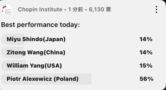 [Music]ショパンコンクール 2025 📝Chopin Instituteアンケート 6,130票 今日のベストパフォーマンス ⭐️Best performance today: Miyu Shindo(Japan)14% Zitong Wang(China)14% William Yang (USA)15% Piotr Alexewicz (Poland)56%