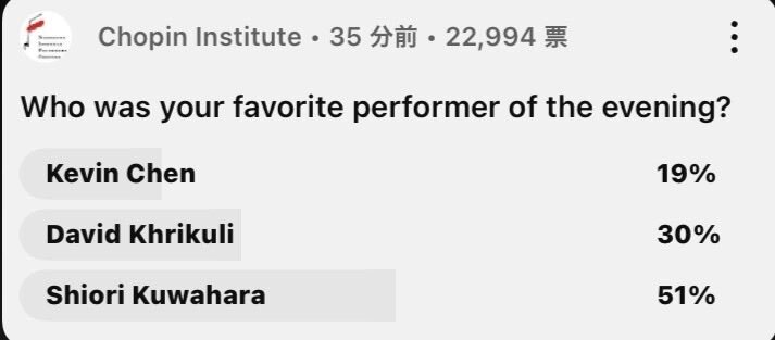 [Music]ショパンコンクール2025 📝Chopin Institute アンケート• 35分間• 22,994票 ⭐️今日のベストパフォーマンス Kevin Chen 19% David Khrikuli 30% Shiori Kuwahara 51% pic.x.com/RkRFPcsScj x.com/kinen_papico/s…