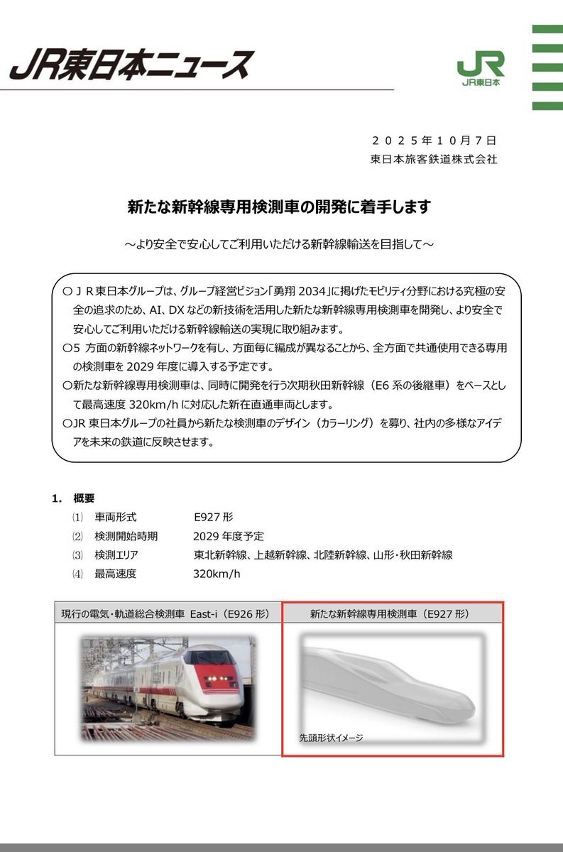 JR東日本、新幹線検測車「E927形」を2029年度導入 全方面共通で時速320キロ対応 traicy.com/posts/20251017… @traicycomより