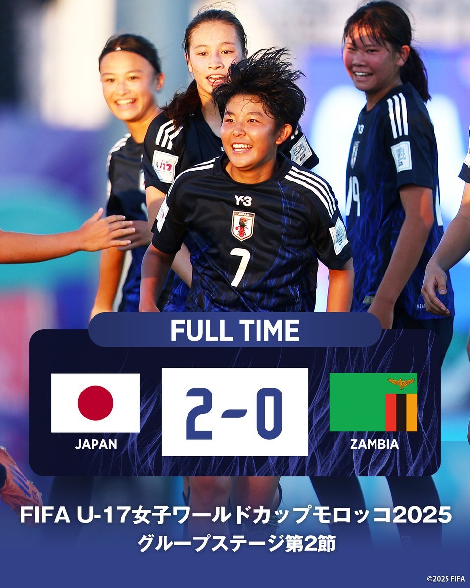 🔹️試合終了🔹️ 🏆FIFA U-17女子ワールドカップモロッコ2025 ⚔️グループステージ第2節 🇯🇵U-17日本女子代表 2-0 U-17ザンビア女子代表🇿🇲 ⌚️1:00(🇯🇵) 📱FIFA+(plus.fifa.com/en/content/jap…) 🔗jfa.jp/national_team/… #U17WWC @FIFAWWC #夢への勇気を #U17日本女子代表 #jfa #daihyo #nadeshiko