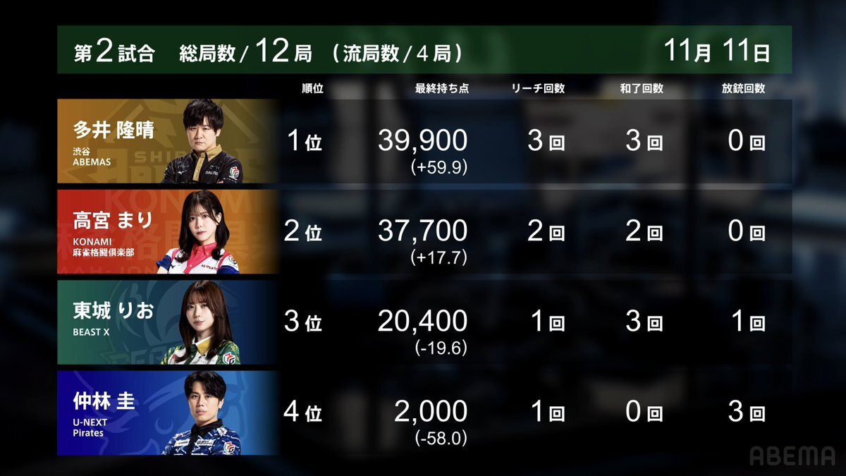 【#Mリーグ 実況】 第2試合詳細結果です。 ABEMAS・多井は粘り強く戦い値千金の裏ドラを乗せてトップ獲得! 麻雀格闘倶楽部・高宮は序盤にリードを重ねるも一歩及ばず! ▼本日の対戦の見逃し視聴はこちらをタップ🀄 abema.go.link/4evP7