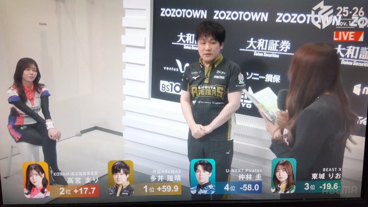 #Mリーグ 2526Day34 2nd #渋谷ABEMAS は今日オンラインPV日 マネージャー業も好調な? #多井隆晴 が ここまで直接対決で勝てず続きの #KONAMI麻雀格闘倶楽部 #高宮まり との競り合いでのオーラスで 空切リーチからの和了でトップとなり チーム同日連勝も果たし #BEASTX を交わしチーム3位浮上 pic.x.com/uwOAY899wt
