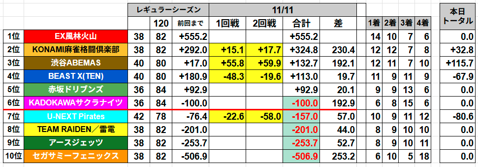 Mリーグ2025-26 レギュラーシーズン第34日(11/11) 3upkobetujuku.com/1111-4 第2回戦 渋谷ABEMAS 多井隆晴:+59.9P KONAMI麻雀格闘倶楽部 高宮まり:+17.7P BEAST X 東城りお:-19.6P U-NEXT Pirates 仲林圭:-58.0P pic.x.com/OULmngV9Wy