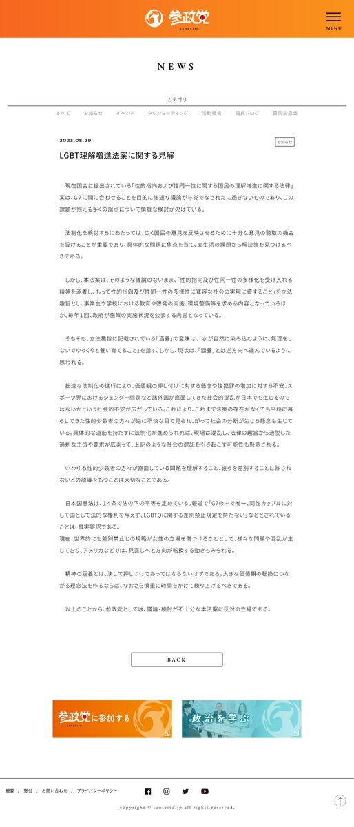 今の日本の社会では、平穏に暮らせないと感じているから、カムアウトしない人が多いのでは > これまで法案の存在がなくても平穏に暮らしてきた性的少数者の方々が逆に不快な目で見られ、却って社会の分断が生じる懸念も生じている。 LGBT理解増進法案に関する見解 | 参政党 sanseito.jp/2020/news/7505/