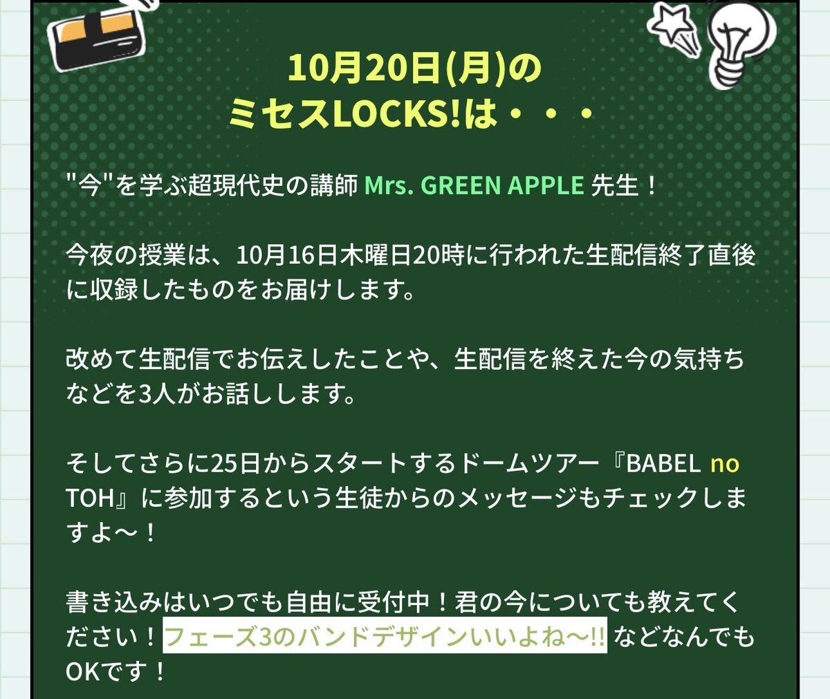 10/20(月) #MrsGREENAPPLE -----予定----- ▶ 5:00 『Wonder Museum』 東京会場「Ringo Jam」会員先行(年会員対象)受付終了 ▶ 22:42『LIFE!マーベラスSP』NHK ONE配信終了 ▶ 23:08『ミセスLOCKS!』 -----受付中----- ▶≪"BABEL no TOH"≫POP-UP サッポロファクトリー事前先着予約 ▶ pic.x.com/XUs4oZJYcn