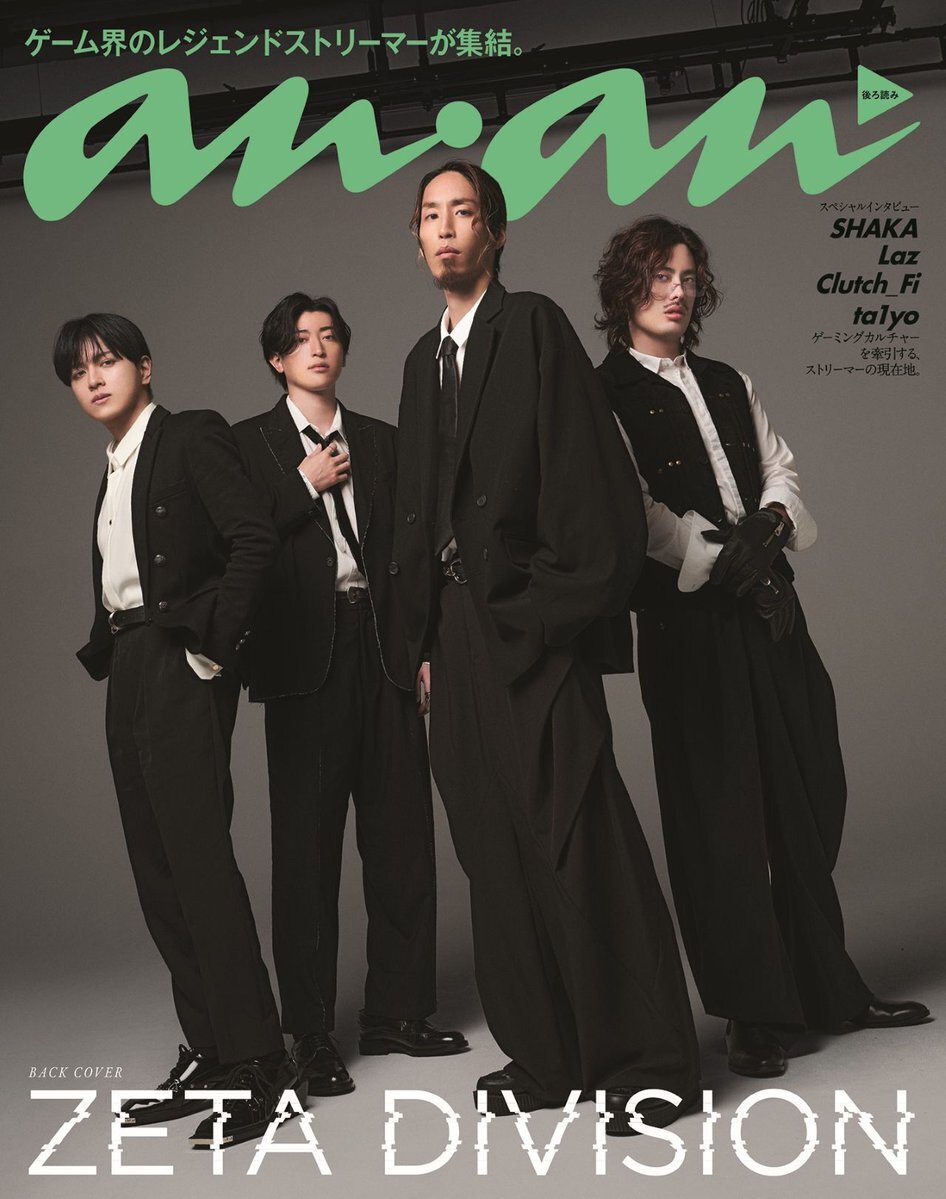 【#ananバックカバー 2473号解禁】 ZETA DIVISION(@zetadivision)からレジェンド級ストリーマー・SHAKA、Laz、Clutch_Fi、ta1yoが #anan バックカバーに登場! 大人の色気を纏った黒フォーマルで、普段の配信中とのギャップ満載です! @avashaka @lazvell @Clutch_Fi @ta1yo_tv #ZETADIVISION