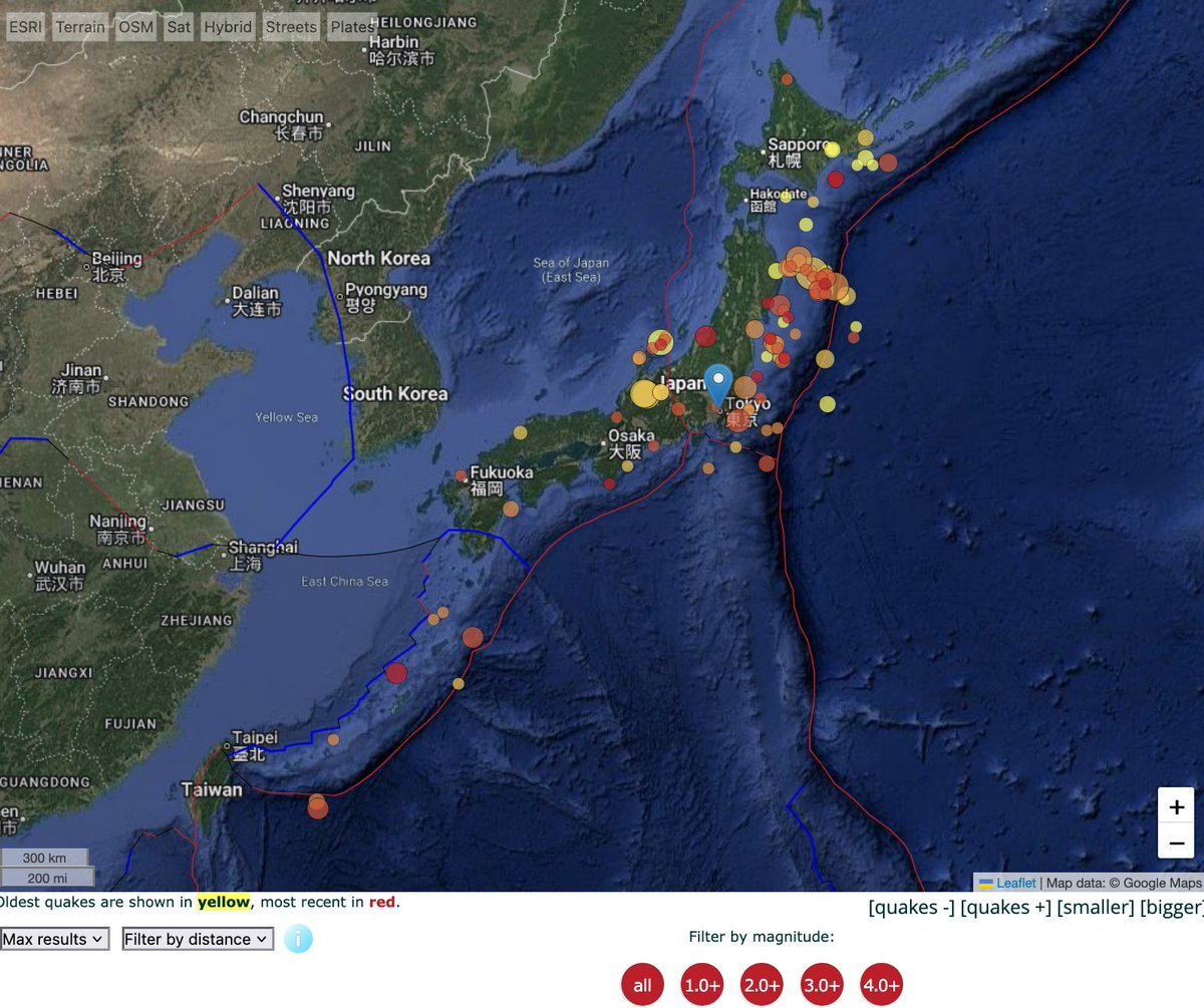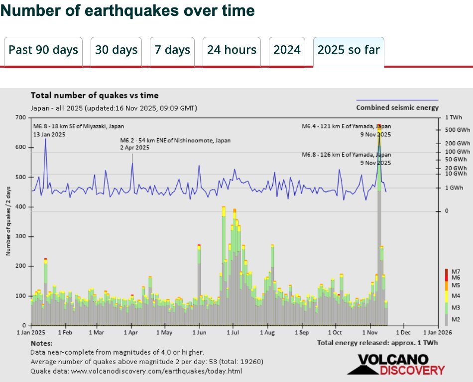 グラフは今年今日迄日本で発生したM4以上の地震数の2日毎の合計と同エネルギー量(ワット) 地図は過去24時間以内に発生した全ての地震及びM4の震央をプロットしたもの 後者は岐阜高山付近および佐渡付近でそれぞれM4.1とM4.3、M4.0が発生 pic.x.com/dbZYO3DPog
