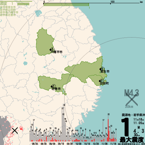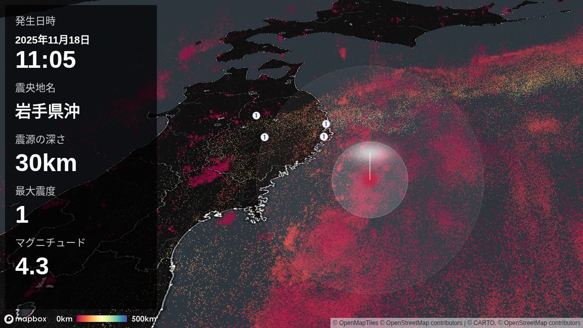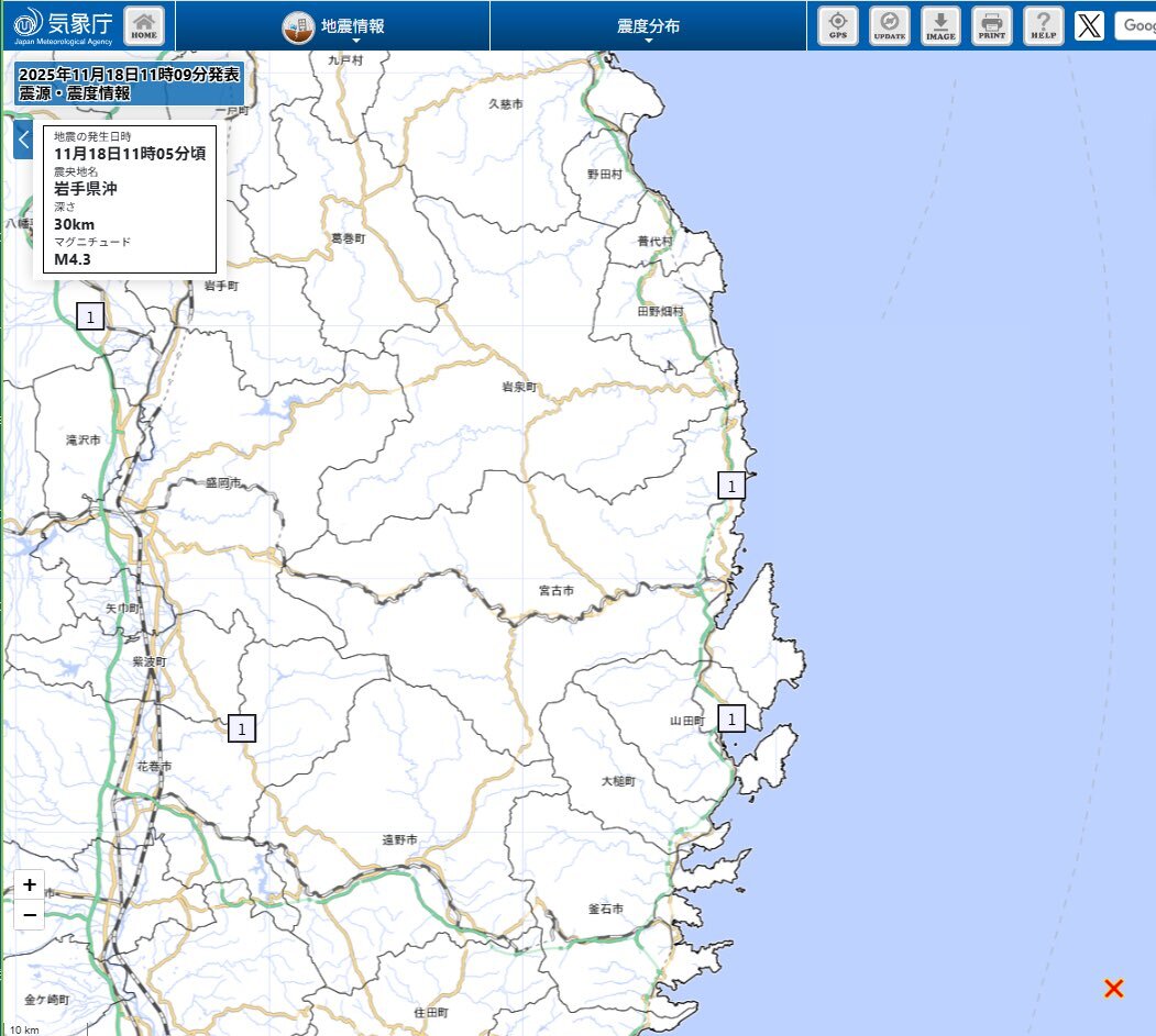 [11/18 11:05]岩手県沖の深さ約30kmを震源とするM4.3の地震がありました。岩手県で最大震度1を観測しました。この地震による津波の心配はありません。 pic.x.com/YlYaax32ty