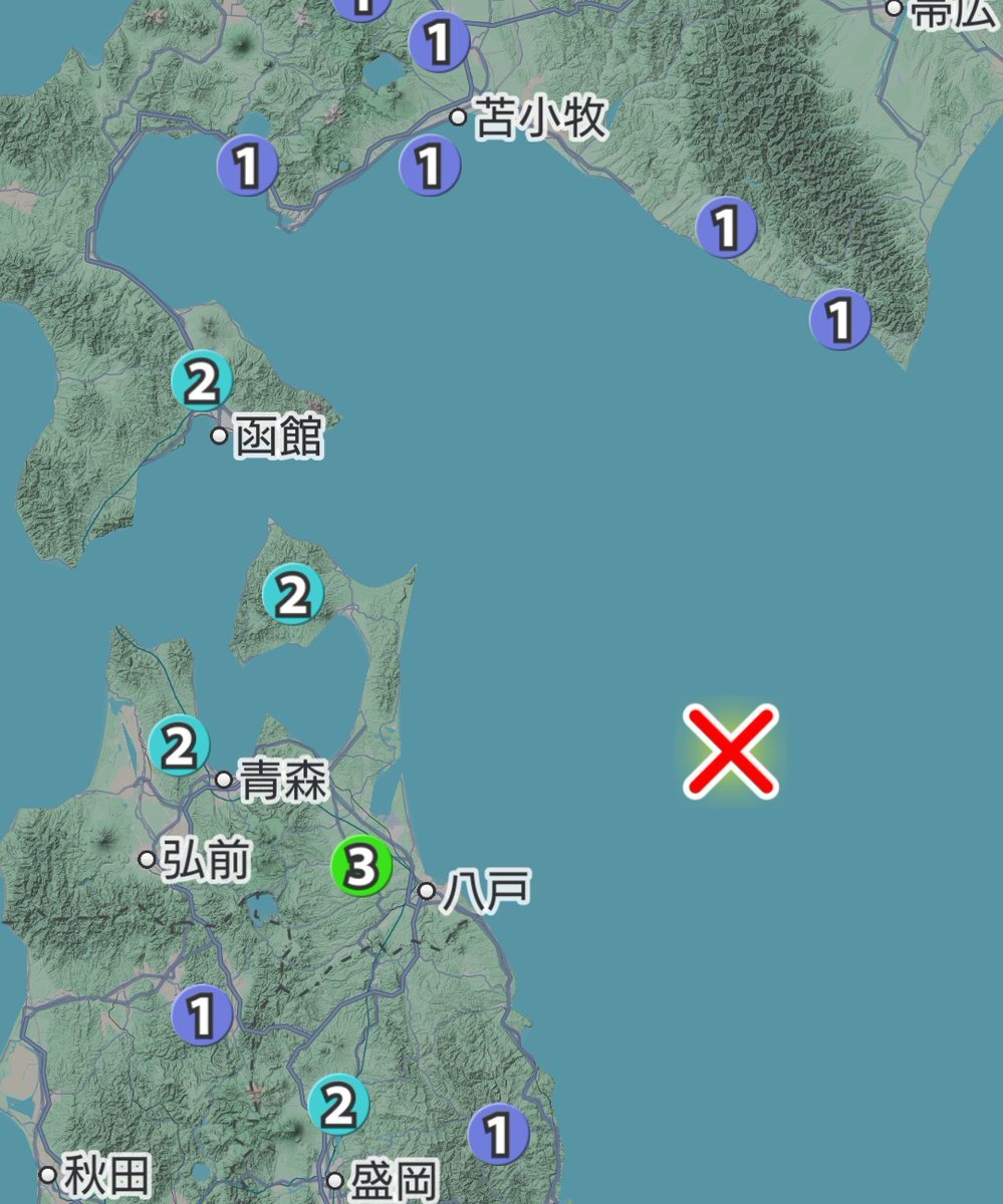 11時台と12時台に東北地方で震度1の地震 (1) 11:05頃 岩手県沖 深さ30km M4.3 岩手県宮古市田老,花巻市大迫町,八幡平市田頭,山田町大沢で震度1 (2) 12:03頃 宮城県沖 深さ60km M3宮城県 宮城県気仙沼市赤岩,同市笹が陣,南三陸町歌津 岩手県大船渡市 大船渡町,一関市室根町,同市藤沢町で震度1 pic.x.com/tJz84KnVY8