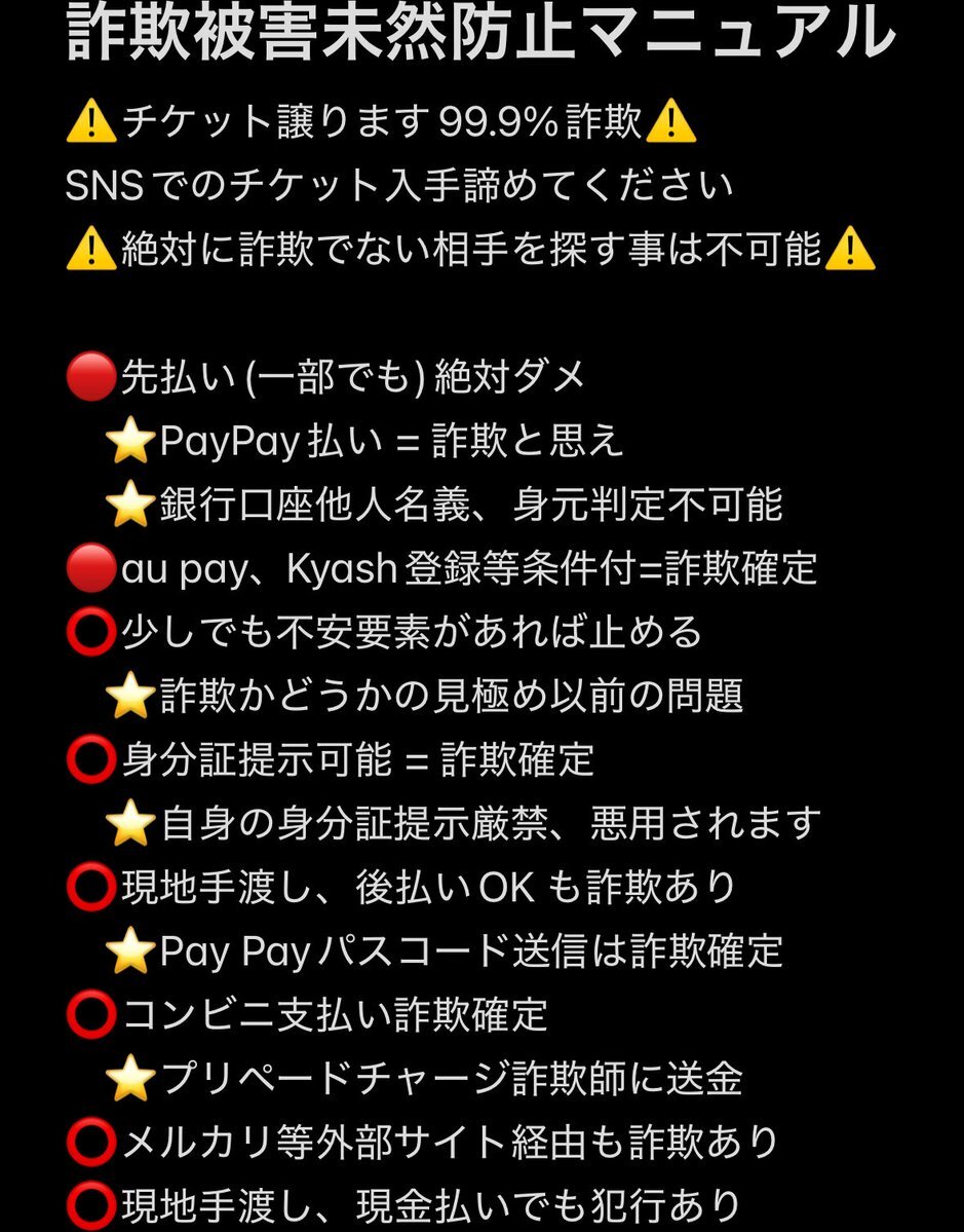 1216 ⚠️チケット詐欺 注意喚起⚠️ RADWIMPS 20th ANNIVERSARY LIVE TOUR 11/24 神奈川横浜 12/2 12/3 大阪 12/14 愛知名古屋 12/20 12/21 香川 12/26 12/27 東京有明 #RADWIMPS #RADWIMPS20th_SP ⚠️チケット譲ります99.9%詐欺⚠️ ⭐️詐欺被害未然防止マニュアルご覧ください↓ x.com/fraudsweeper/s…