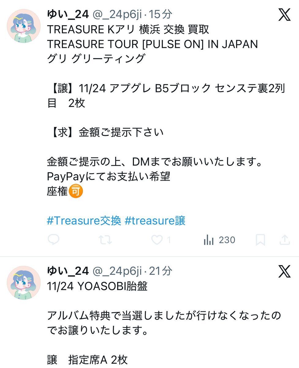 1218 ⚠️チケット詐欺垢注意喚起 ID変更⚠️ TREASURE TOUR [PULSE ON] IN JAPAN グリ グリーティング Kアリーナ横浜 11/24 アプグレ B5ブロック センステ裏2 #Treasure交換 #treasure譲 11/24 YOASOBI胎盤 譲 指定席A 2枚 求 定価 RADWIMPS 20th ANNIVERSARY LIVE TOUR 11/24横浜アリーナ pic.x.com/rq0ntAXAyb