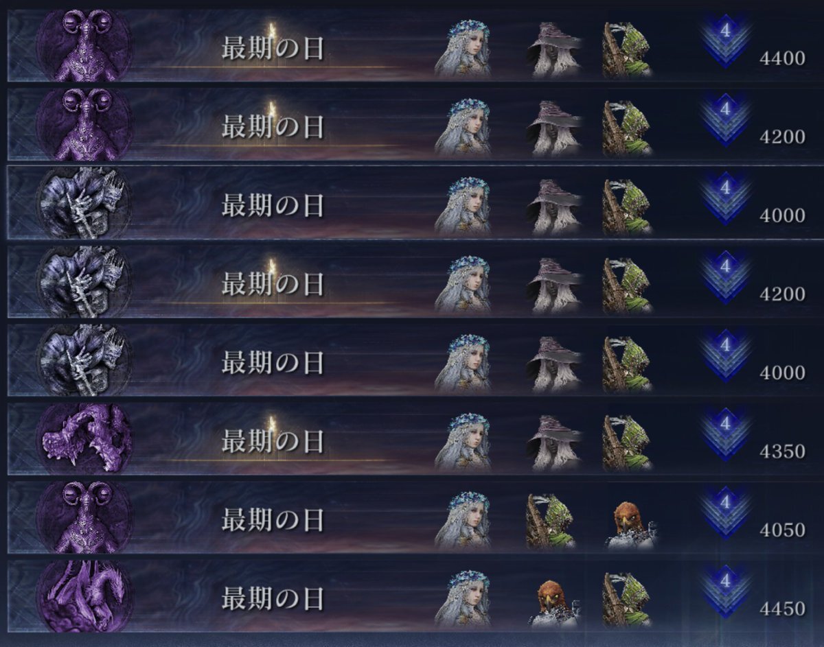 エルデンリング ナイトレイン。 予想通り深度4と3を行ったり来たり。 一度は5400まで稼いだのに昨日のSteam鯖落ちで-600食らって今日酷い味方引いて1日目ボス敗北2回で-1800。 頼むから通常モードで練習してから来てくれってレベルの人が深度4でも居るのが辛い。
