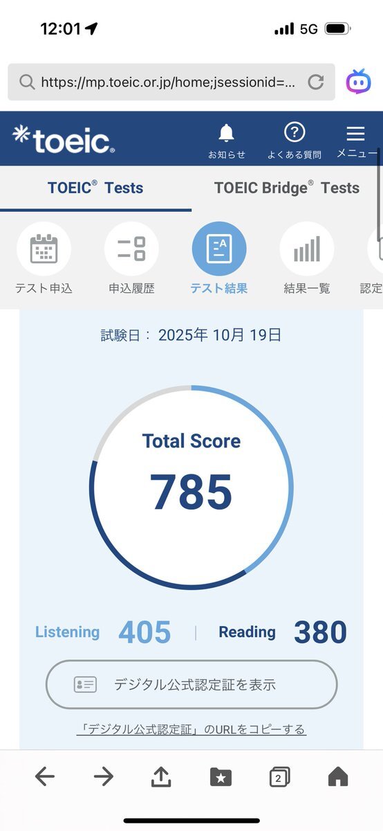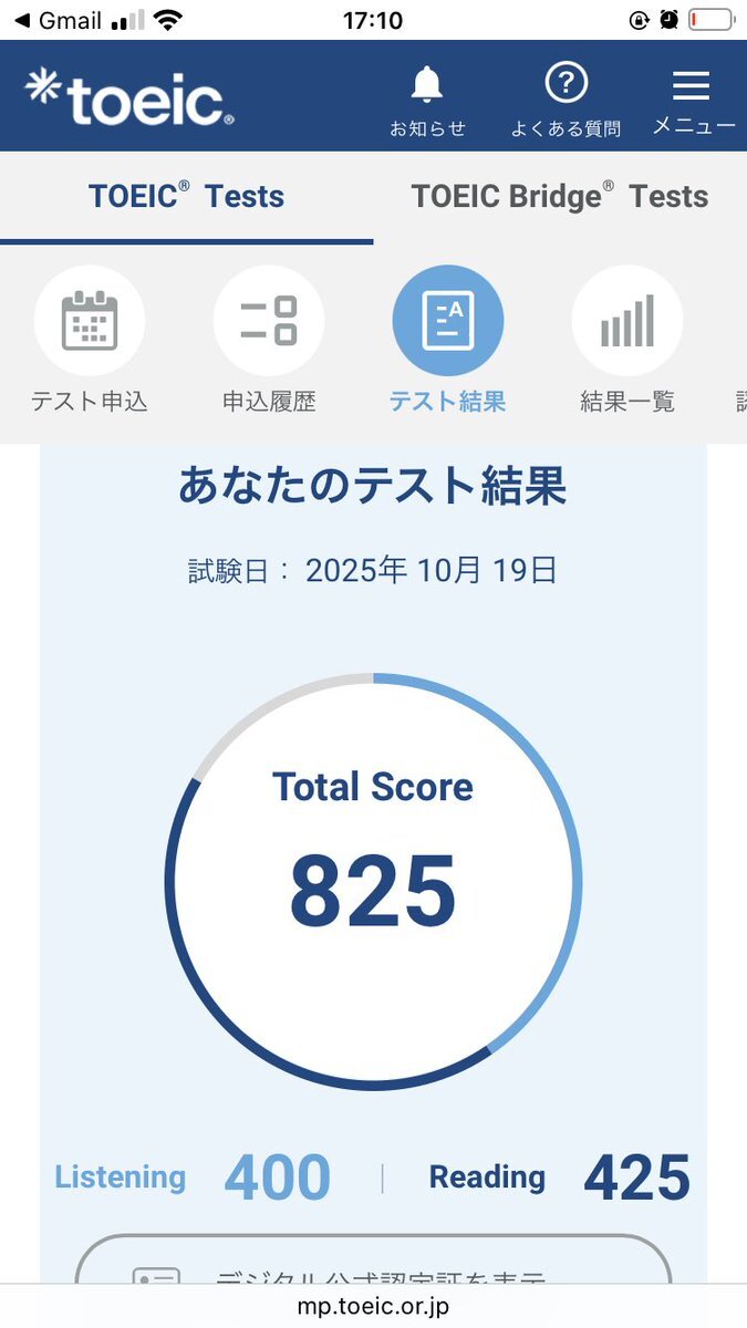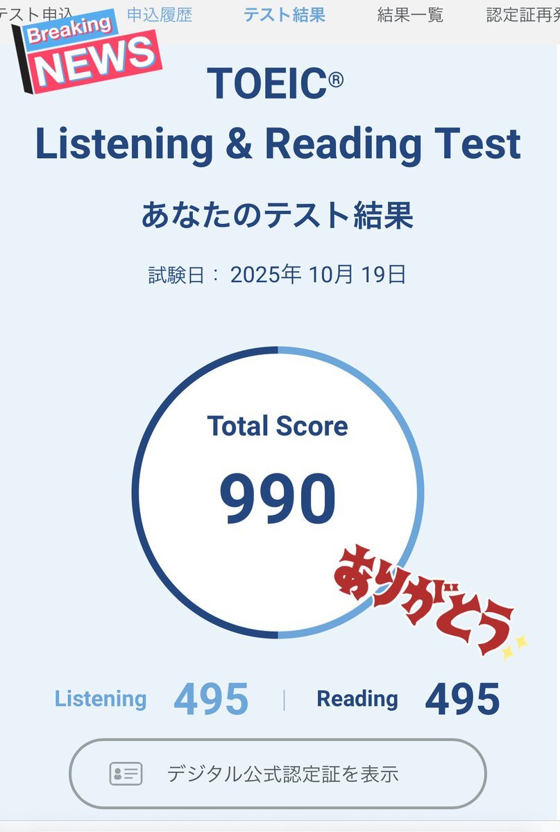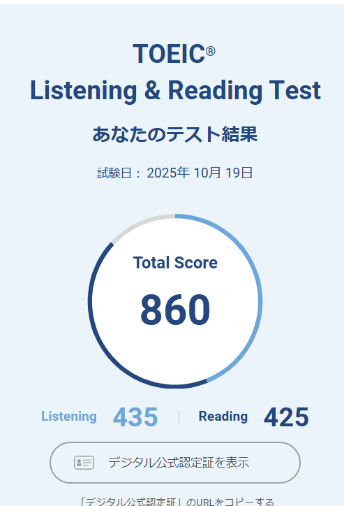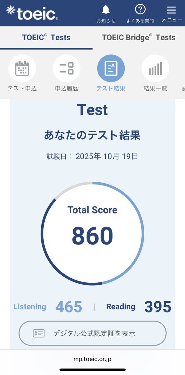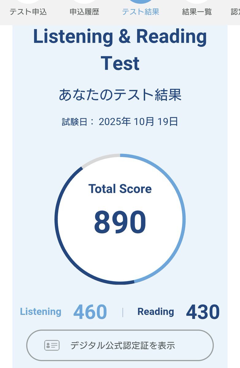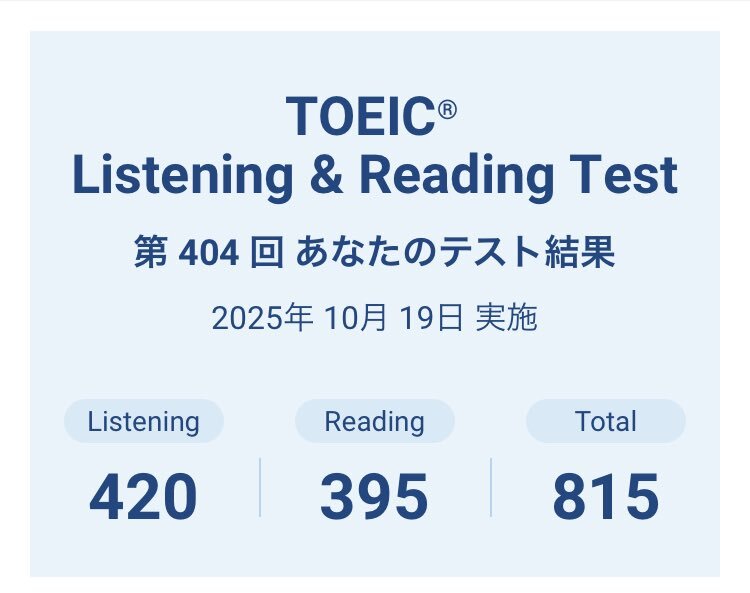toeicの結果が出ました。 リスニングが100点上がった。リーディングは横ばい。英検準二級レベル。リーディングは最後の20問は塗り絵で終わったので、最後まで解ける余裕を持ちたい。ちゃんと頑張れてる。まだまだだけど続けよう。Geminiがそう言ってくれた。 また来年toeicの日に受けよう。