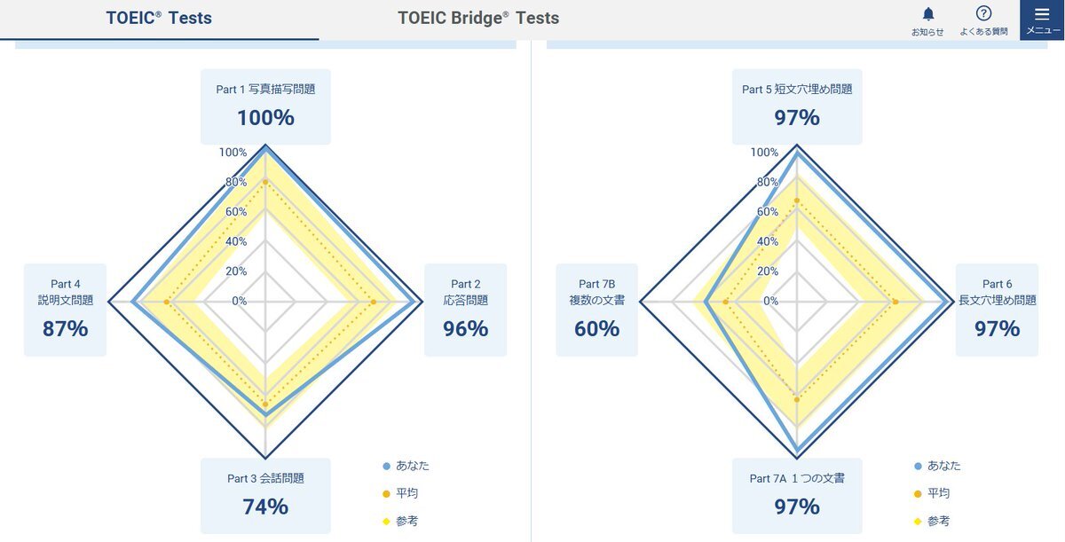 受験料が安くなる「TOEICの日」(10/19)に受験した健康診断TOEICの結果が出て、高1ライバルとほぼ同じ感じの出来だった。リスニングで負けてリーディングで勝ち、トータルは同じくらいという英検と同じ傾向。引き続き置いていかれないようにする。(この段階の正答率はあまり参考にならないけど掲載) pic.x.com/6NZbvQ640X x.com/senkiwork/stat…