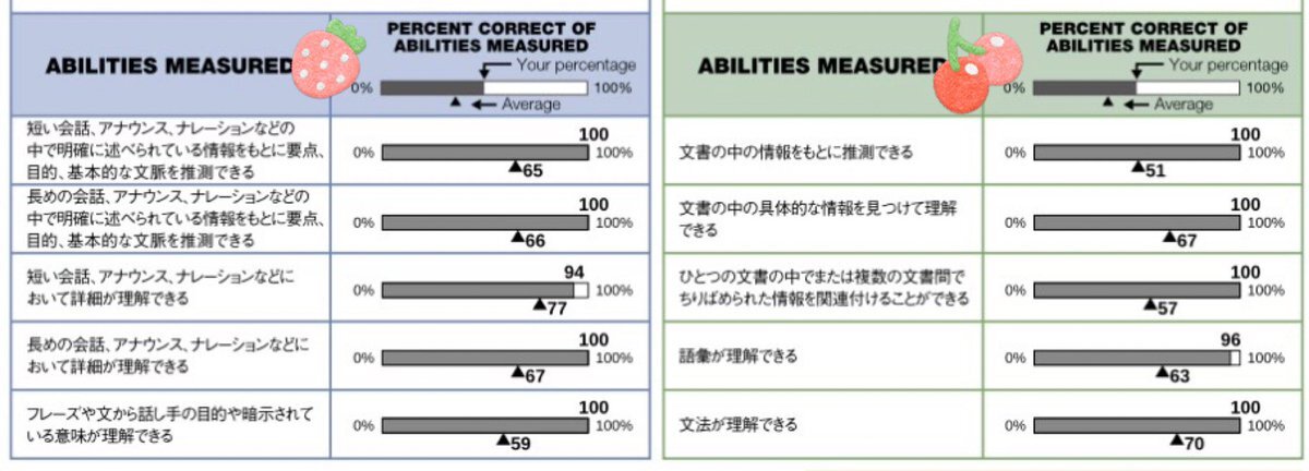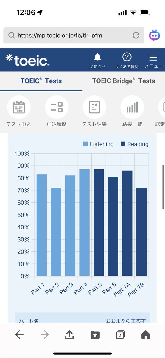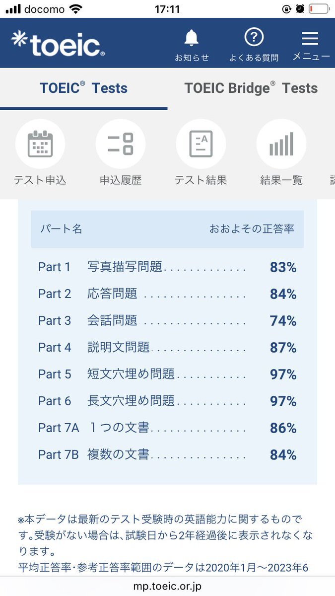 TOEICの日の試験結果です! 720→785に上がりました 試験の日にパート2が自信ないって言ってたんですけどやっぱり低かったです 他は前回より高いと思います!パート3.4とmpも思ったより高い パート1と5と6はもっと取りたかったなー 少しずつ2年前の自己ベストの点数に戻りつつある pic.x.com/8FfLkjsjqh