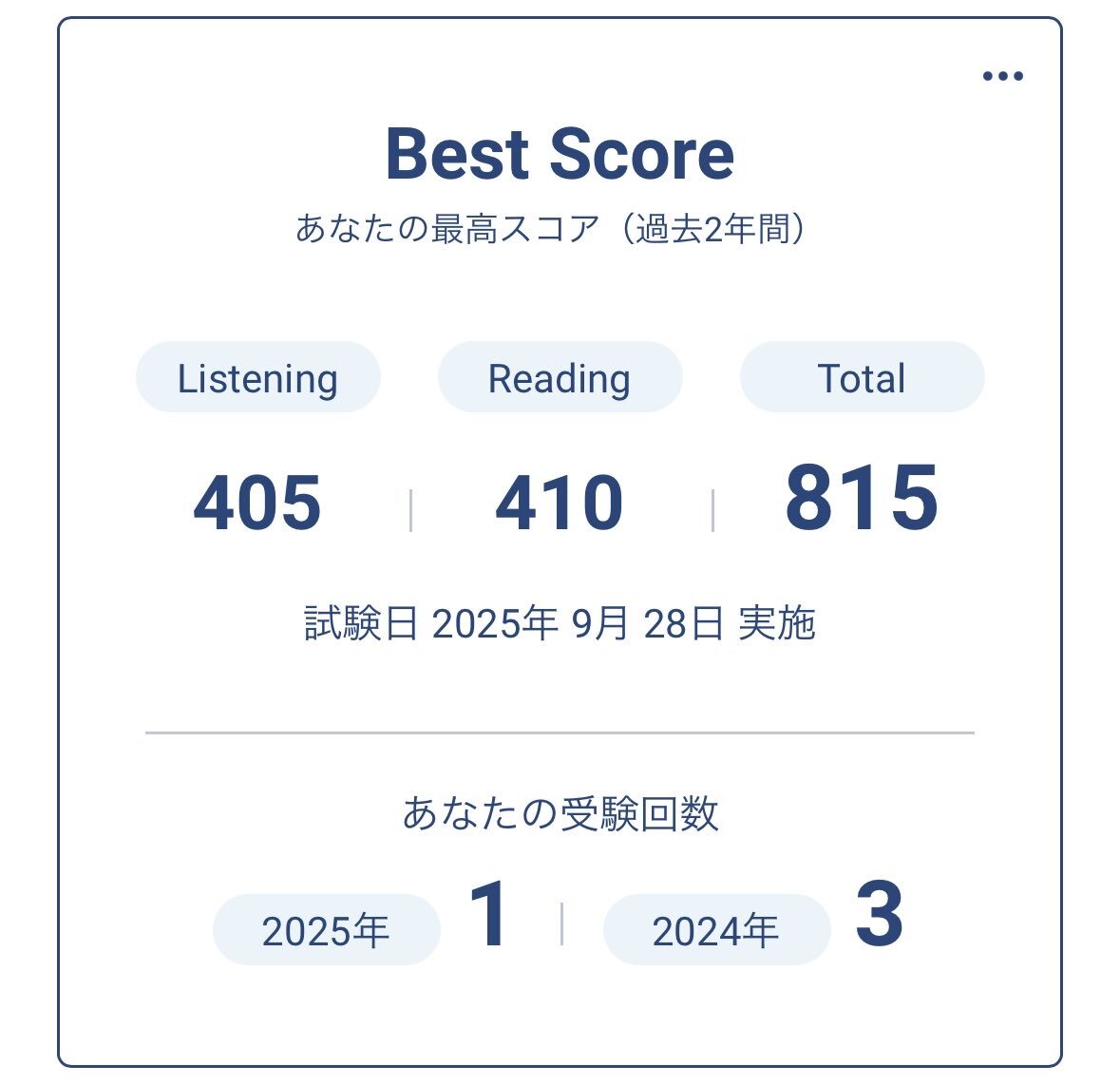 高1娘の4回目のTOEIC結果。民間就活に必要な最低基準800をクリアしたが、英検1級ホルダーでも高校生の社会経験では900が難しい現実を証明。 ①2024/5/26(中3): L370, R275, T645 ②2024/6/23(中3): L385, R310, T695 ③2024/7/28(中3): L395, R385, T780 ④2025/9/28(高1): L405, R410, T815 #TOEIC